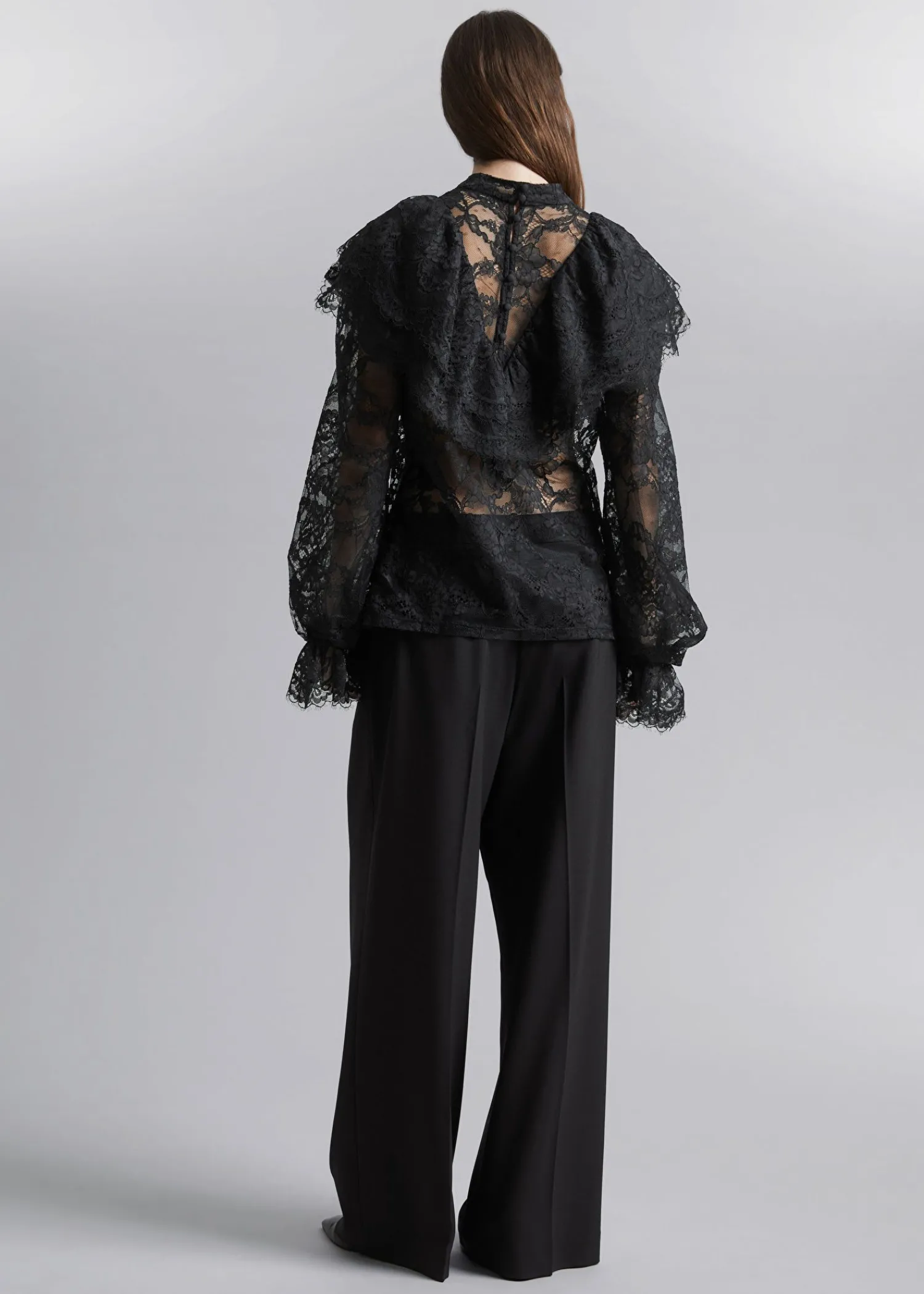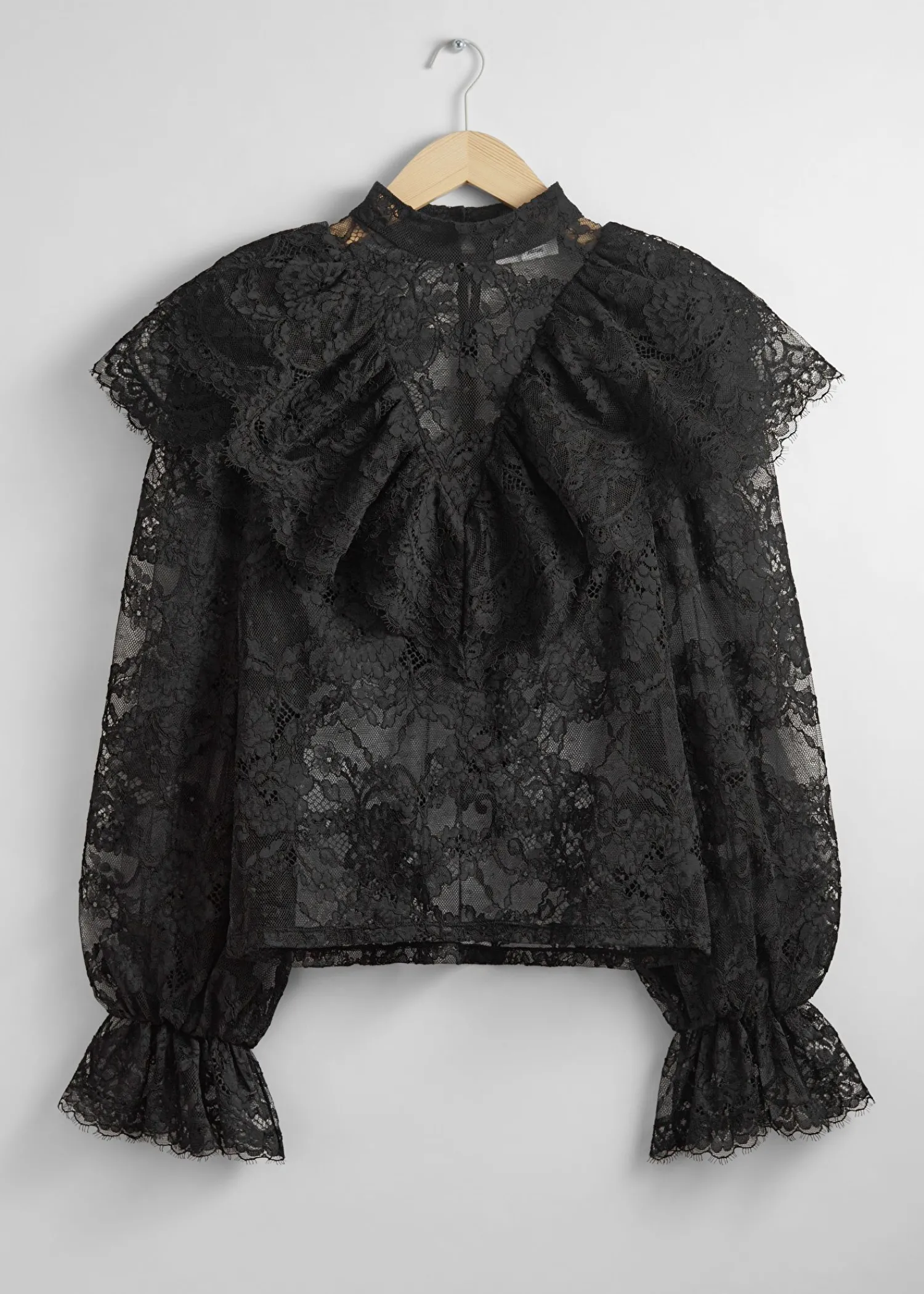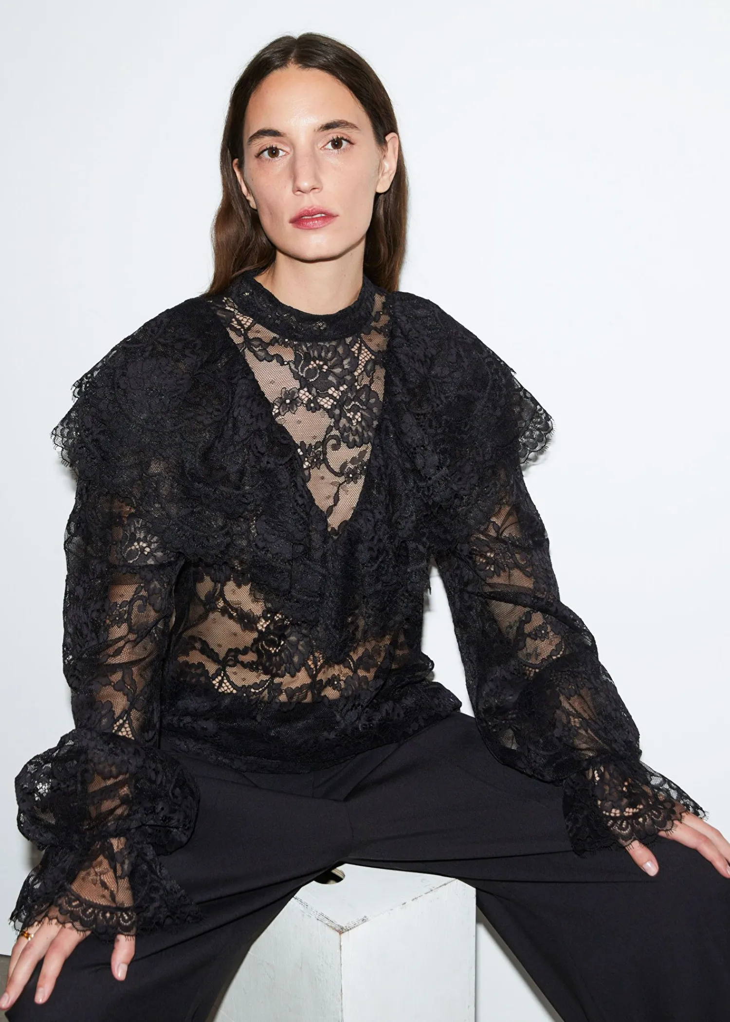 Blondebluse Med Flæser Efter Skuldrene Og Voluminøse Ærmer Med Flæsede Manchetter. Slim Pasform Skærmede Detaljer Ved Flæserne Mock-Hals Med Knaplukninger I Halsen Længde På Blusen: 60 Cm / 23,6″ (Eu 36 / Uk 8 / Us 4)