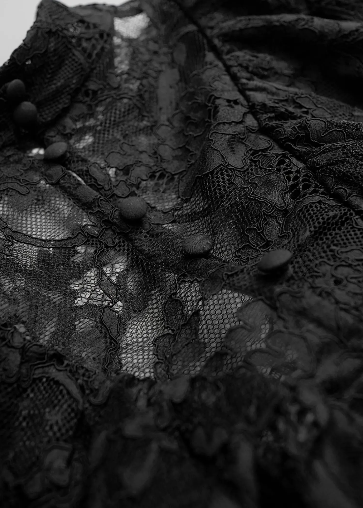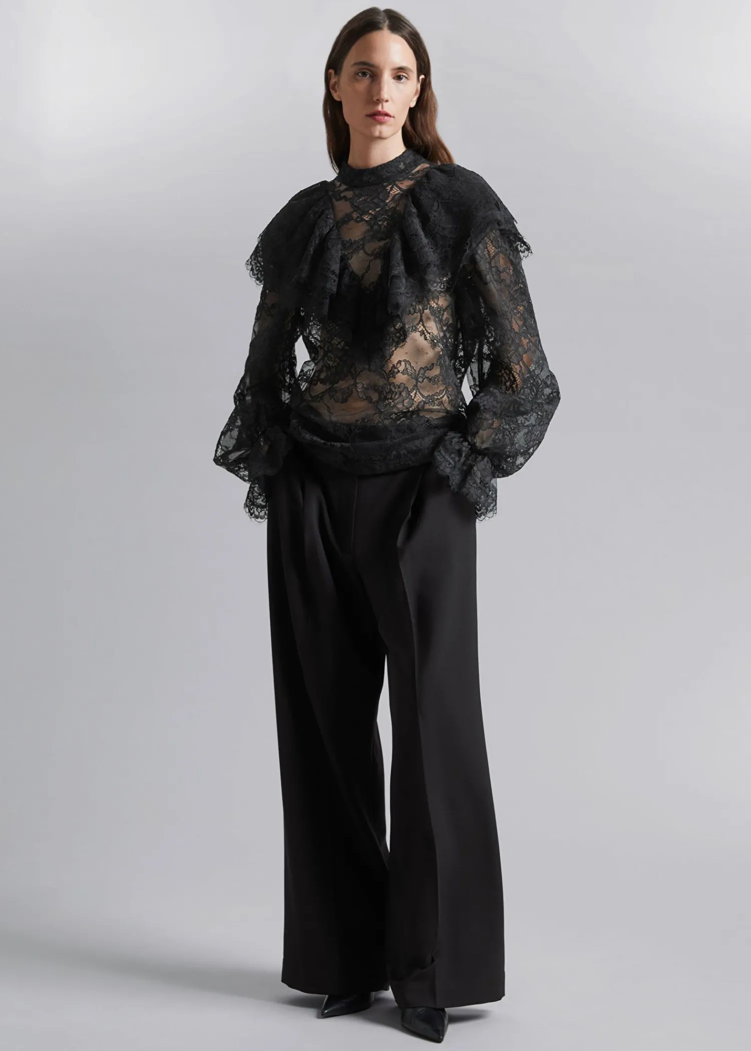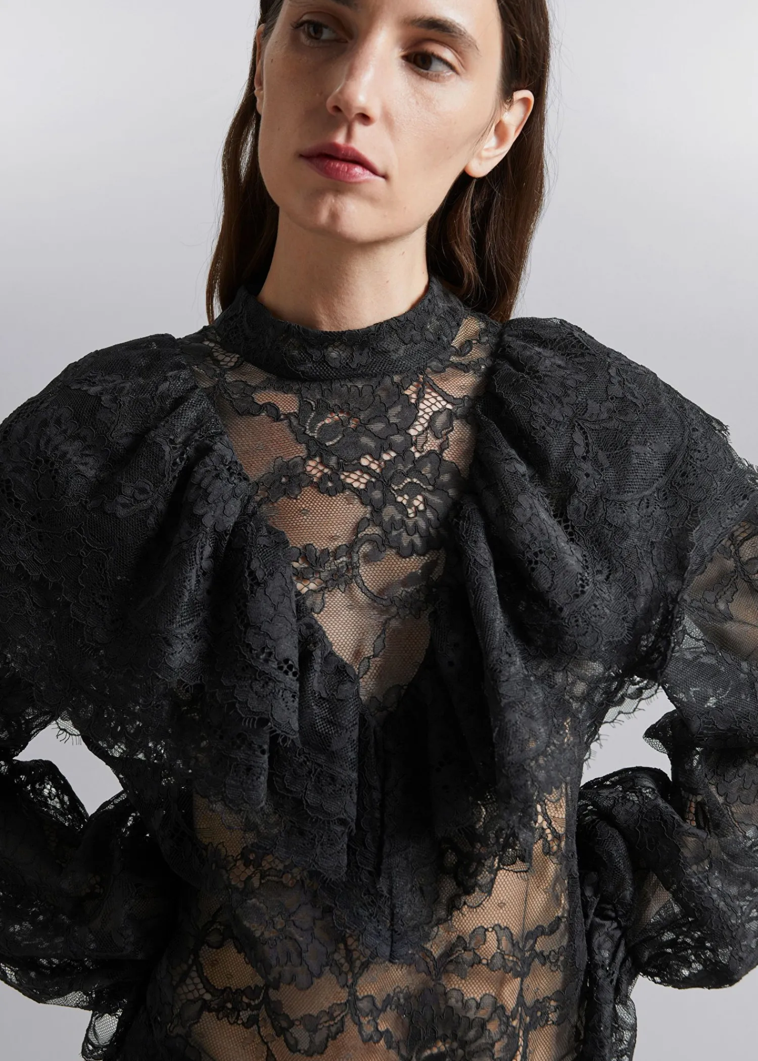 Blondebluse Med Flæser Efter Skuldrene Og Voluminøse Ærmer Med Flæsede Manchetter. Slim Pasform Skærmede Detaljer Ved Flæserne Mock-Hals Med Knaplukninger I Halsen Længde På Blusen: 60 Cm / 23,6″ (Eu 36 / Uk 8 / Us 4)