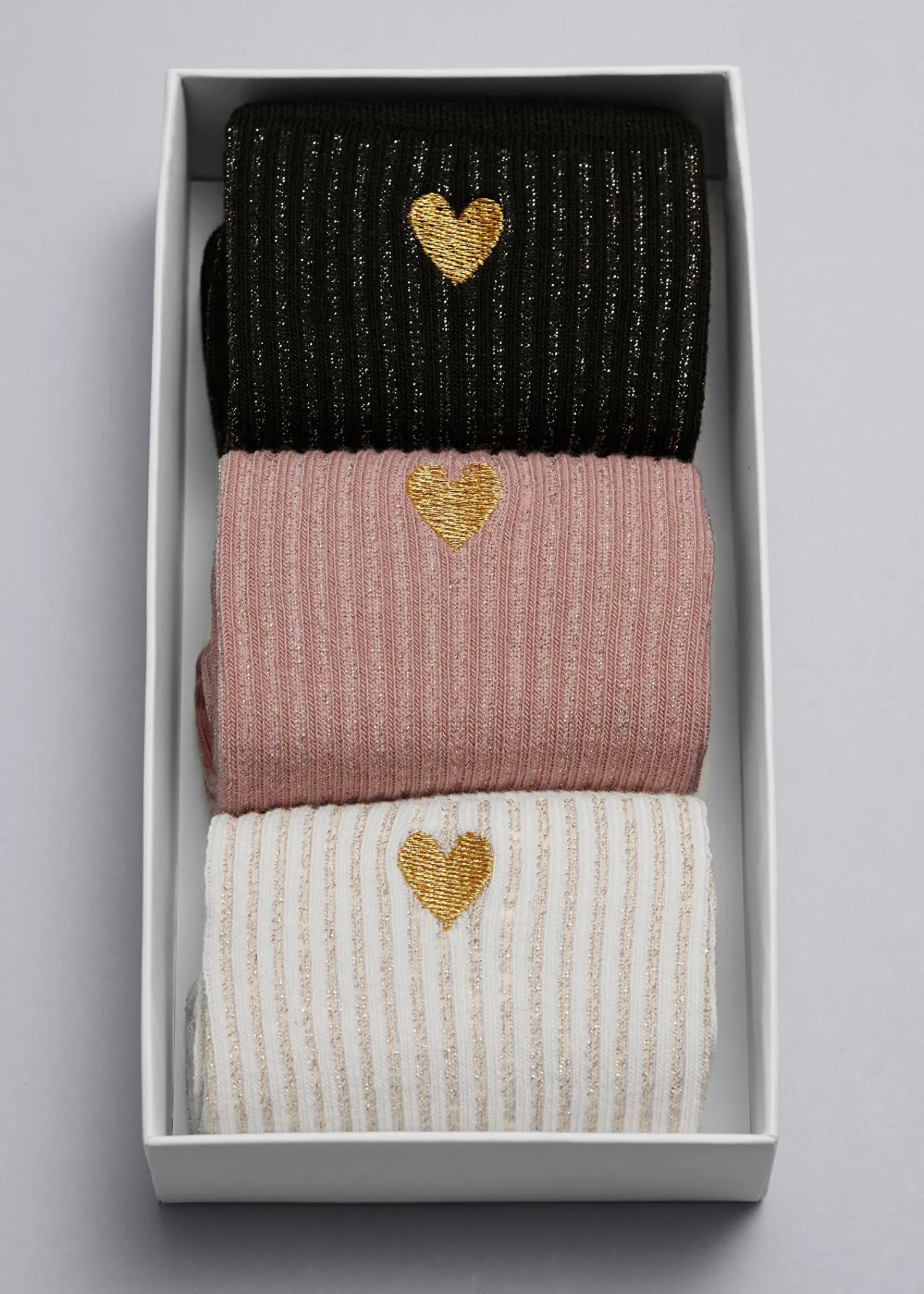 Gaveæske Med Et Sæt Med Tre Glitrende, Ribstrikkede Sokker Med Forstærkede Hæle Og Tæer. Detaljeret Med Broderede, Guldtonede Hjertemotiver.