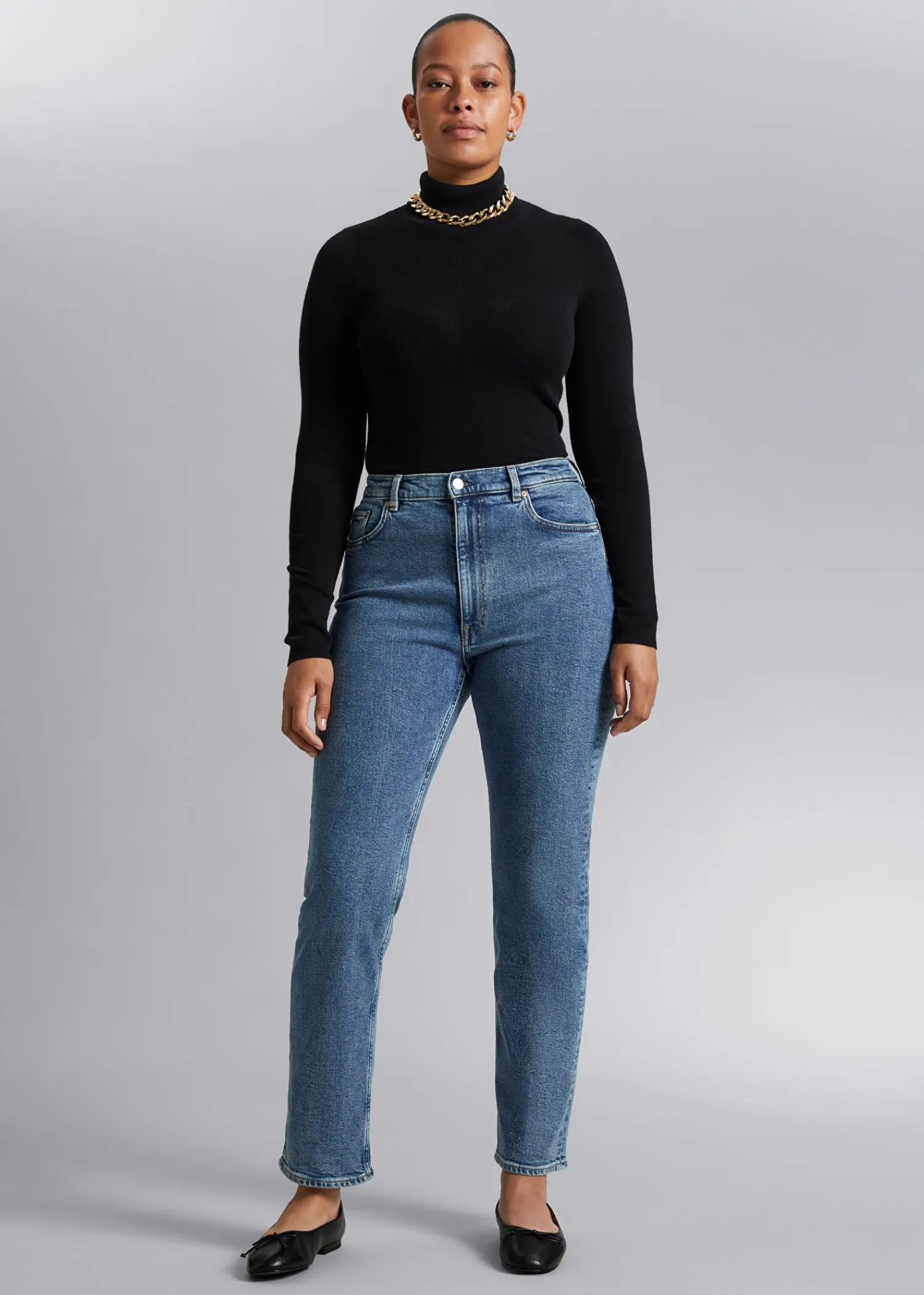 5-Lommers Jeans Med Høj Talje Og Slanke Ben I Fuld Længde. Højtaljet Slanke Ben Comfort Stretch Lynlås Og Knapgylp