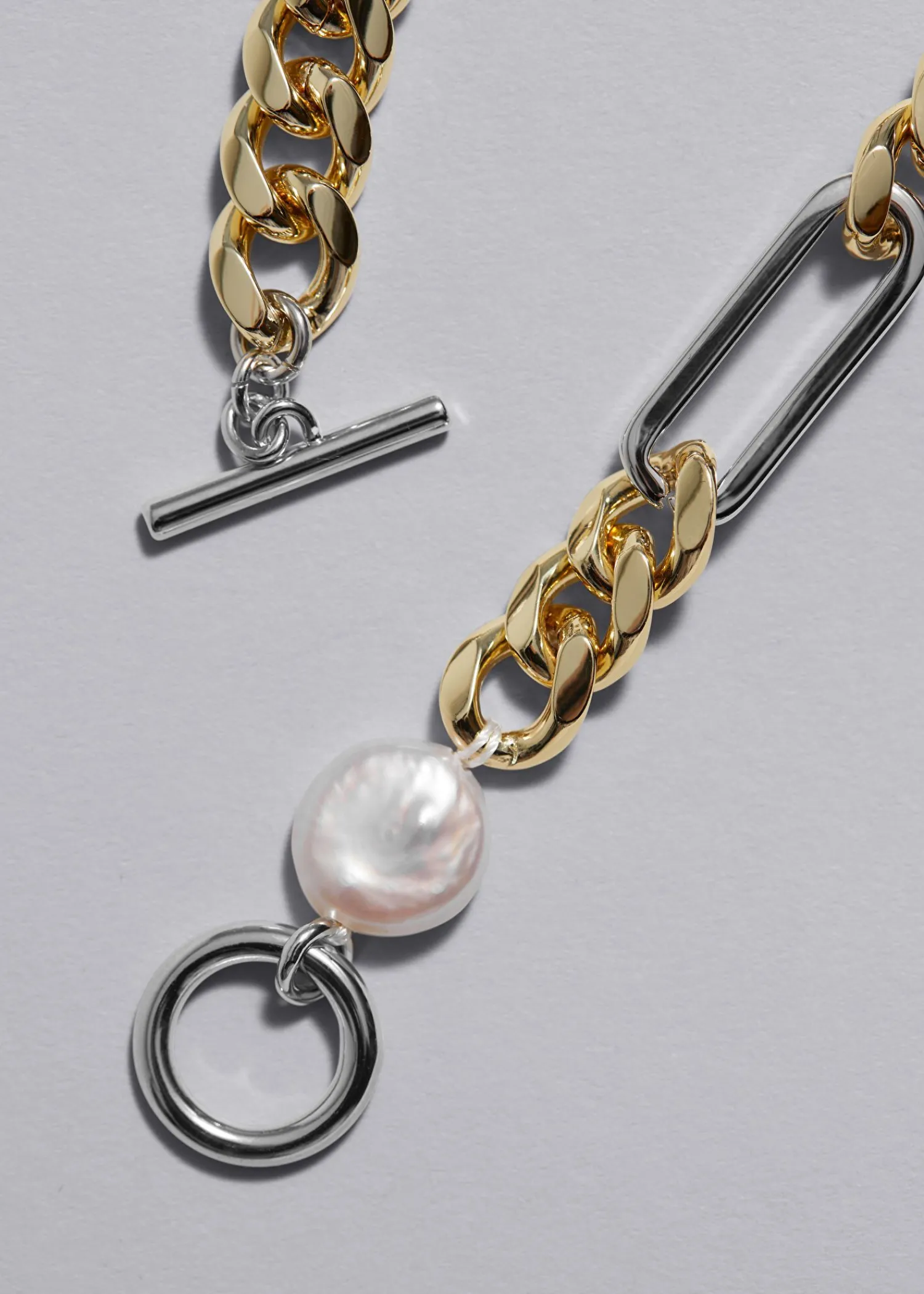 Denne Korte Halskæde Har Links I Forskellige Former Og Størrelser Og Har En Klassisk T-Bar Lukning. Den Er Pyntet Med En Flad Ferskvandsperle. Længde: 42 Cm / 16,5″ Nikkeltestet