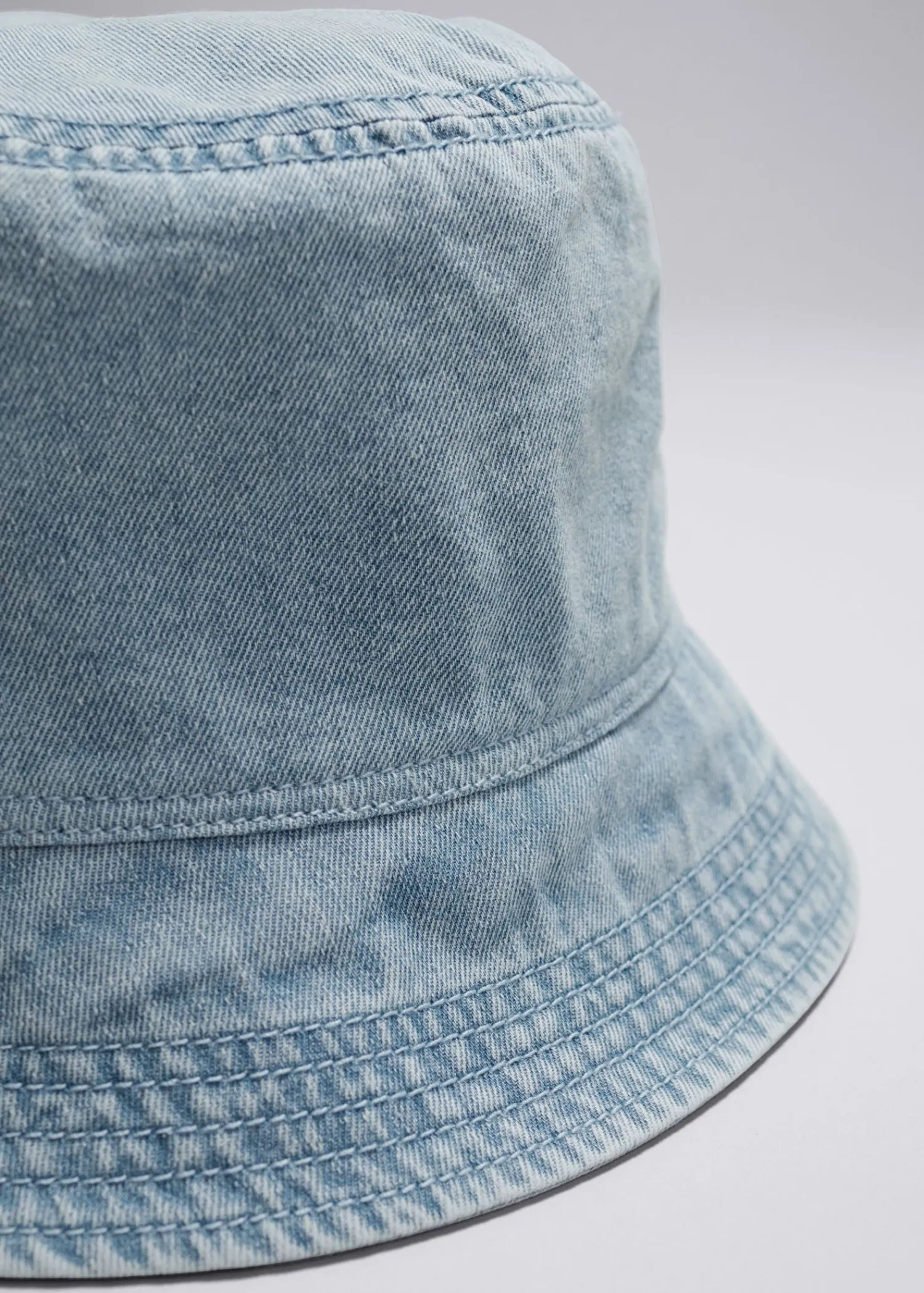 Klassisk Bøttehat I Vasket Denimfinish, Med Kontrastsyede Detaljer.