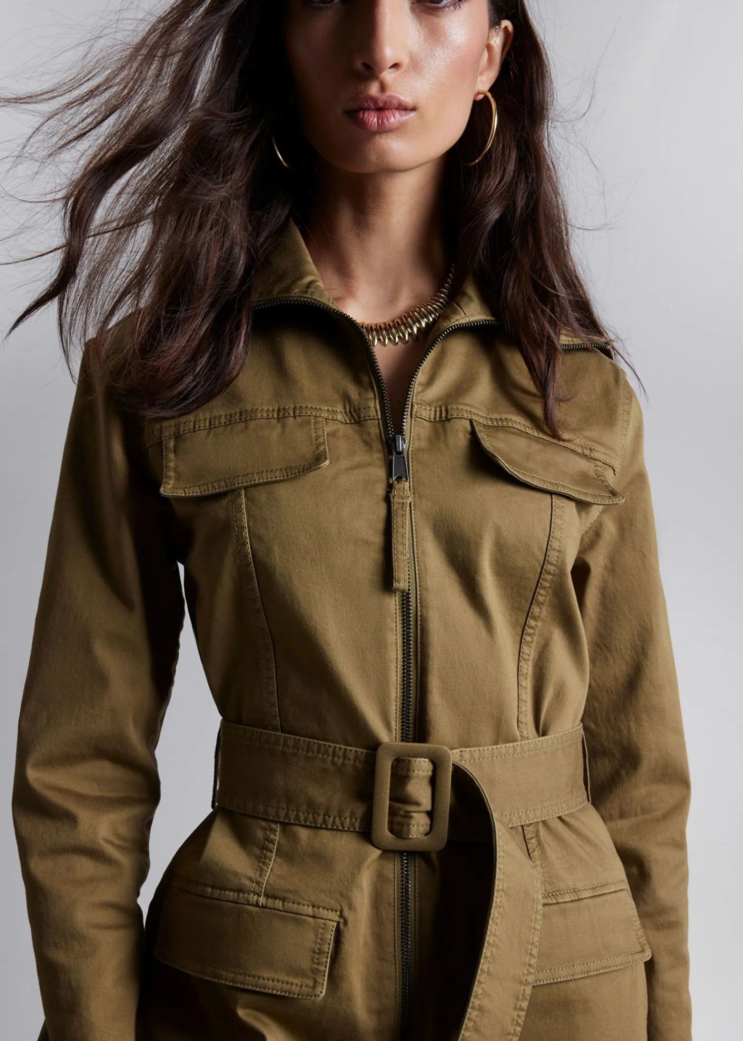 Langærmet Midikjole Med En Arbejdsbeklædningsfinish. Lukkes Med To-Vejs Lynlås Og D-Ring Bælte. Slim Fit Høj Krave To Påsyede Lommer På Brystet Og To På Hofterne Længde På Kjolen: 121,5 Cm / 47,8″ (Eu 36 / Uk 8 / Us 4)