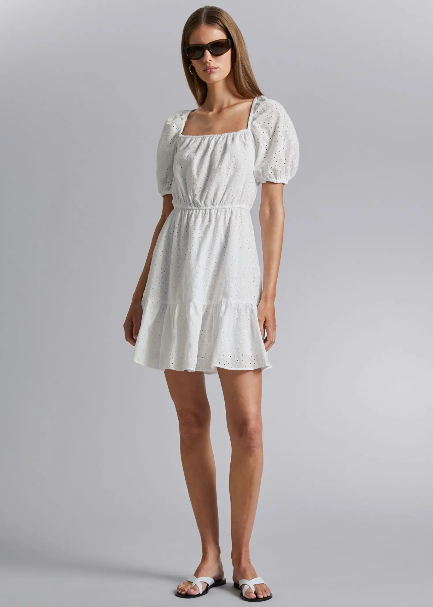 Voluminøs Broderie Aglaise Minikjole Lavet Af Bomuld. Designet Med Korte Pufærmer, En Firkantet Halsudskæring Dekoreret Med Et Allover Broderimønster, Der Er Fastgjort I Halsen Med Tynde Spaghettibånd, Med Et Flået Nederdel. Ryggen Er Lavt Skåret Med En Tynd Elastisk Kanal Langs Sømmen Og Rundt Om Taljen. Kjolens Længde: 64 Cm / 25,2″ (Eu 36 / Uk 8 / Us 4)