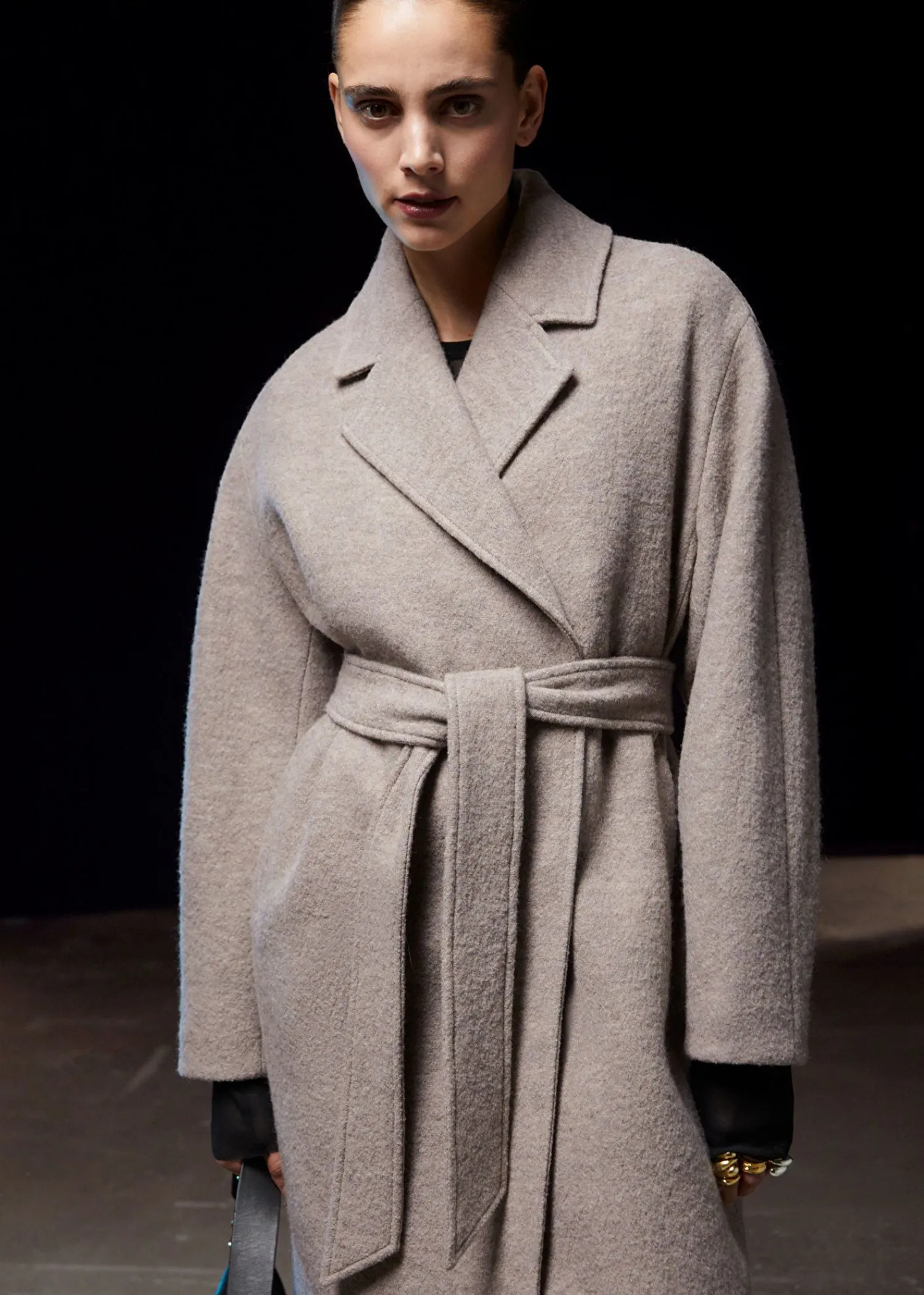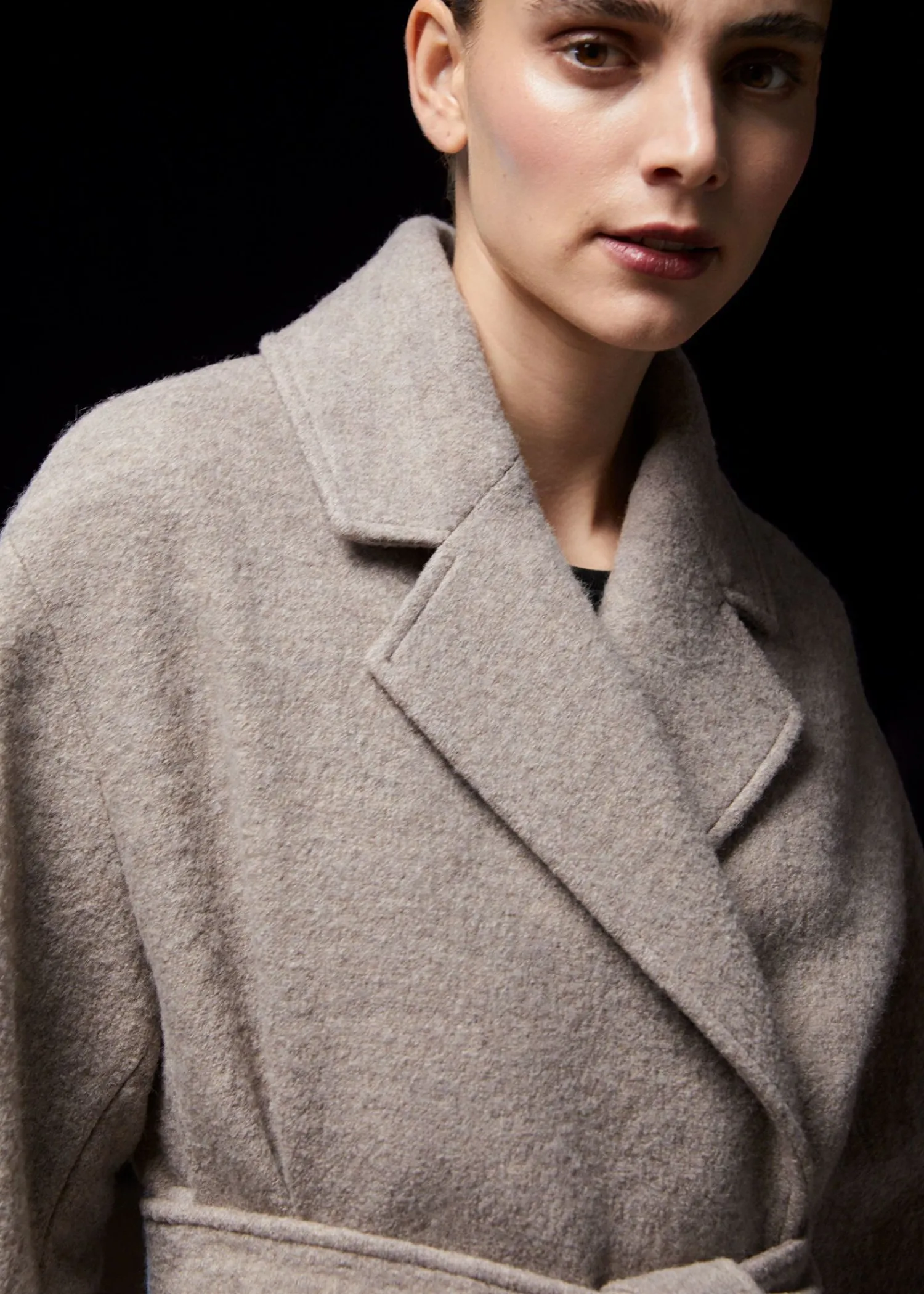 Voluminøs Uldfrakke Med Et Overlappende Revers. Afsluttet Med Et Tonalt Selvbindebælte. Duo Lommer Tre Skjulte Knaplukninger Certificeret I Henhold Til Responsible Wool Standard (Rw0063) Længde På Frakken: 116 Cm / 47,6″ (Størrelse S)