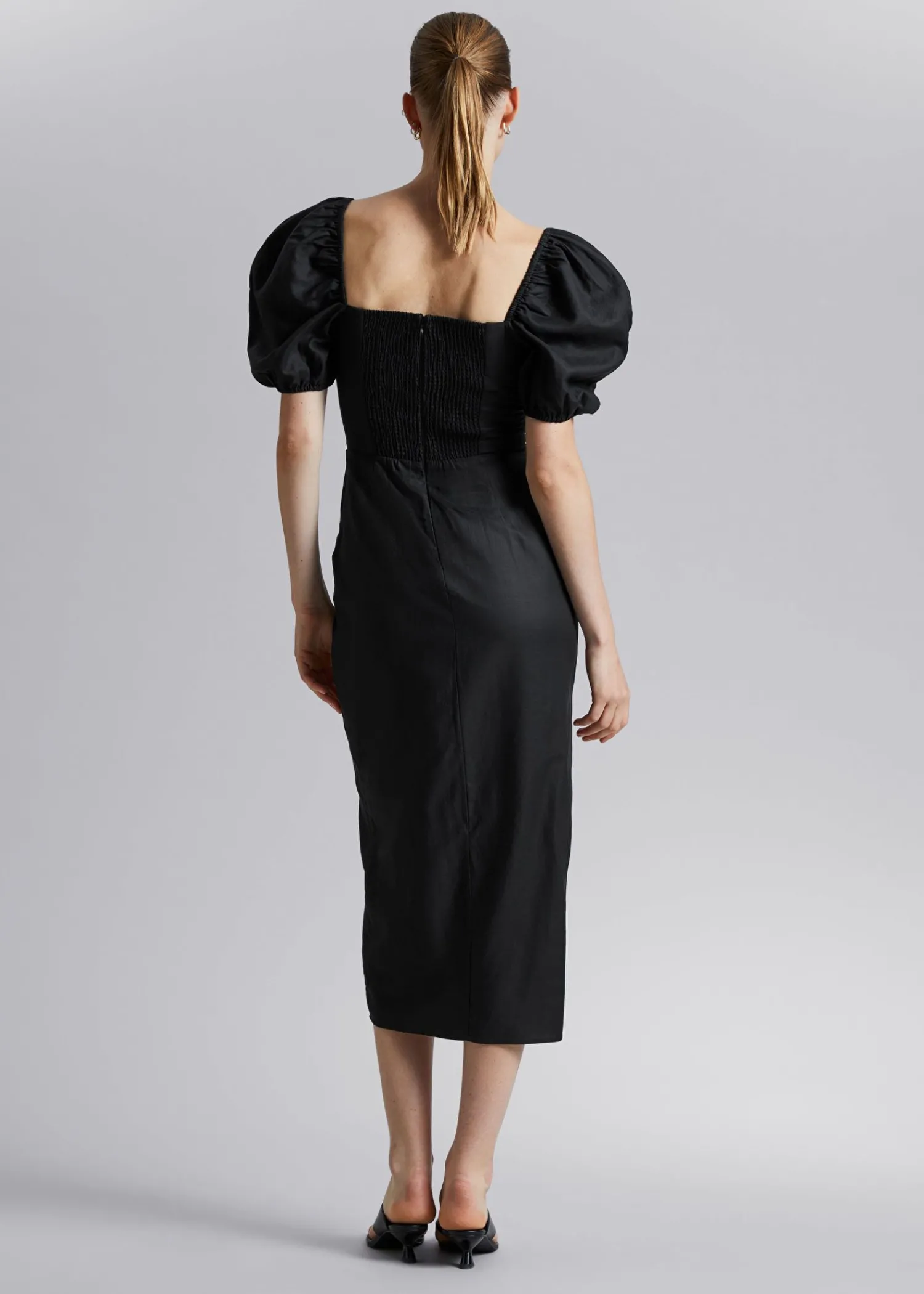 Figursyet Kjole Med Pufærmer Lavet Af En Vævet Blanding Af Materialer. Med En Asymmetrisk Skørt Med Fast Overlægsfoldning, En Overdel Med Smocket Ryg Og Prinsessepustede Ærmer. Skåret Med Firkantet Halsudskæring I Midi-Længde Pasform. – Monteret – Foret Overdel – Lynlåslukning Midt Bagpå Længde På Kjolen: 108 Cm / 42,5″ (Eu 36 / Uk 8 / Us 4)