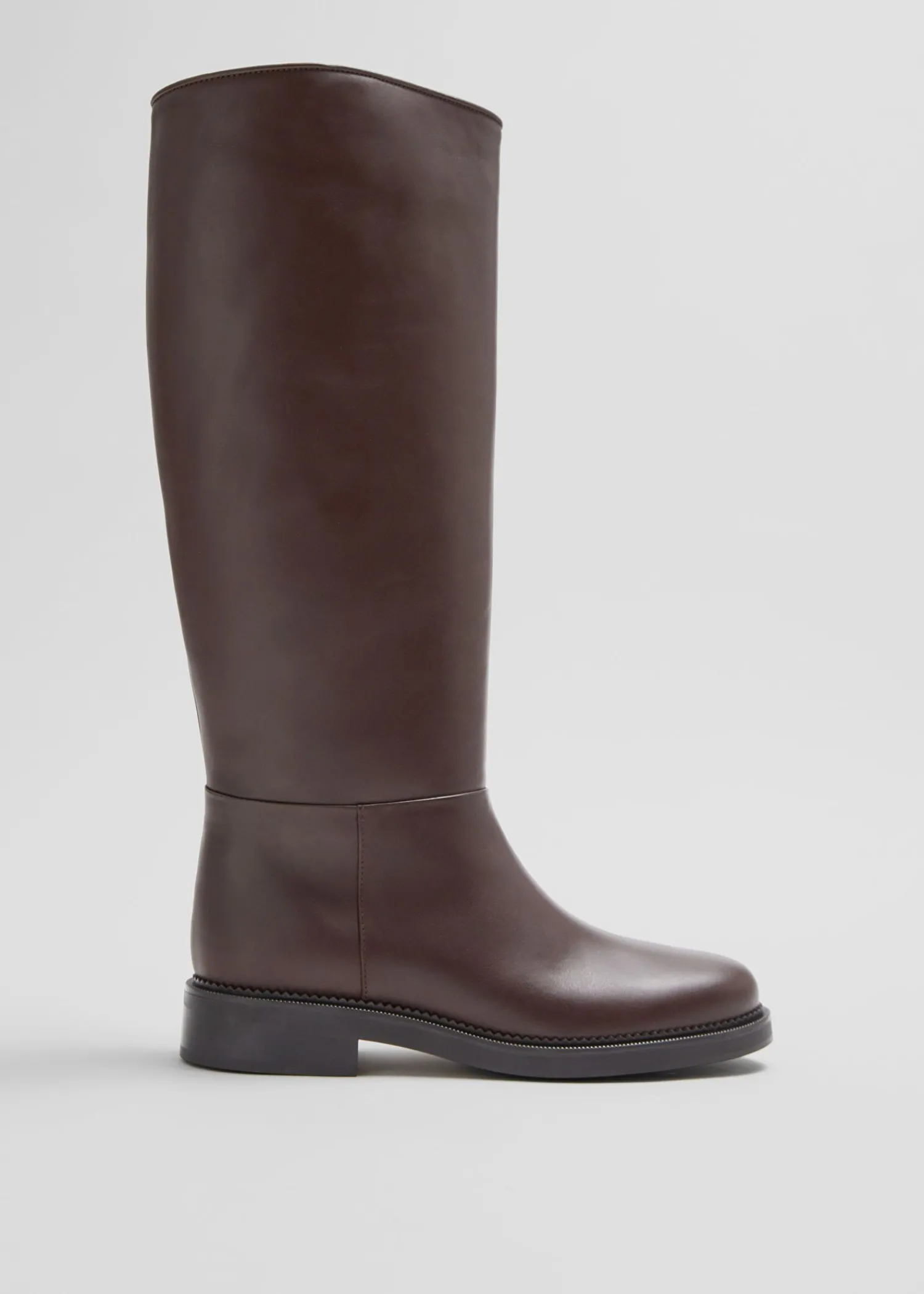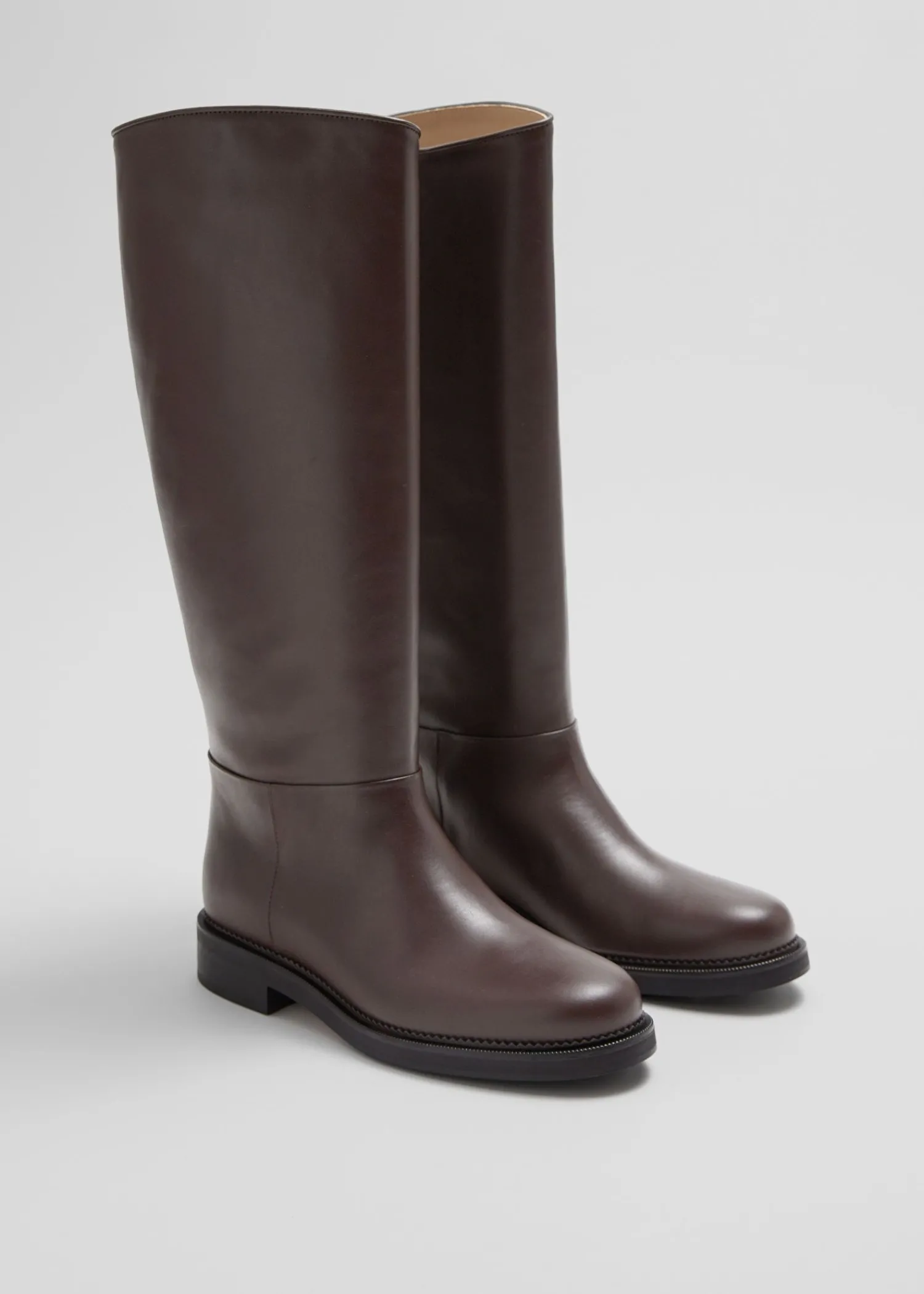 Tidløse Ridestøvler I Læder I En Poleret Glat Finish, Med En Afrundet Tå, Lavt Stablede Hæle Og Et Klassisk Buet Sk…