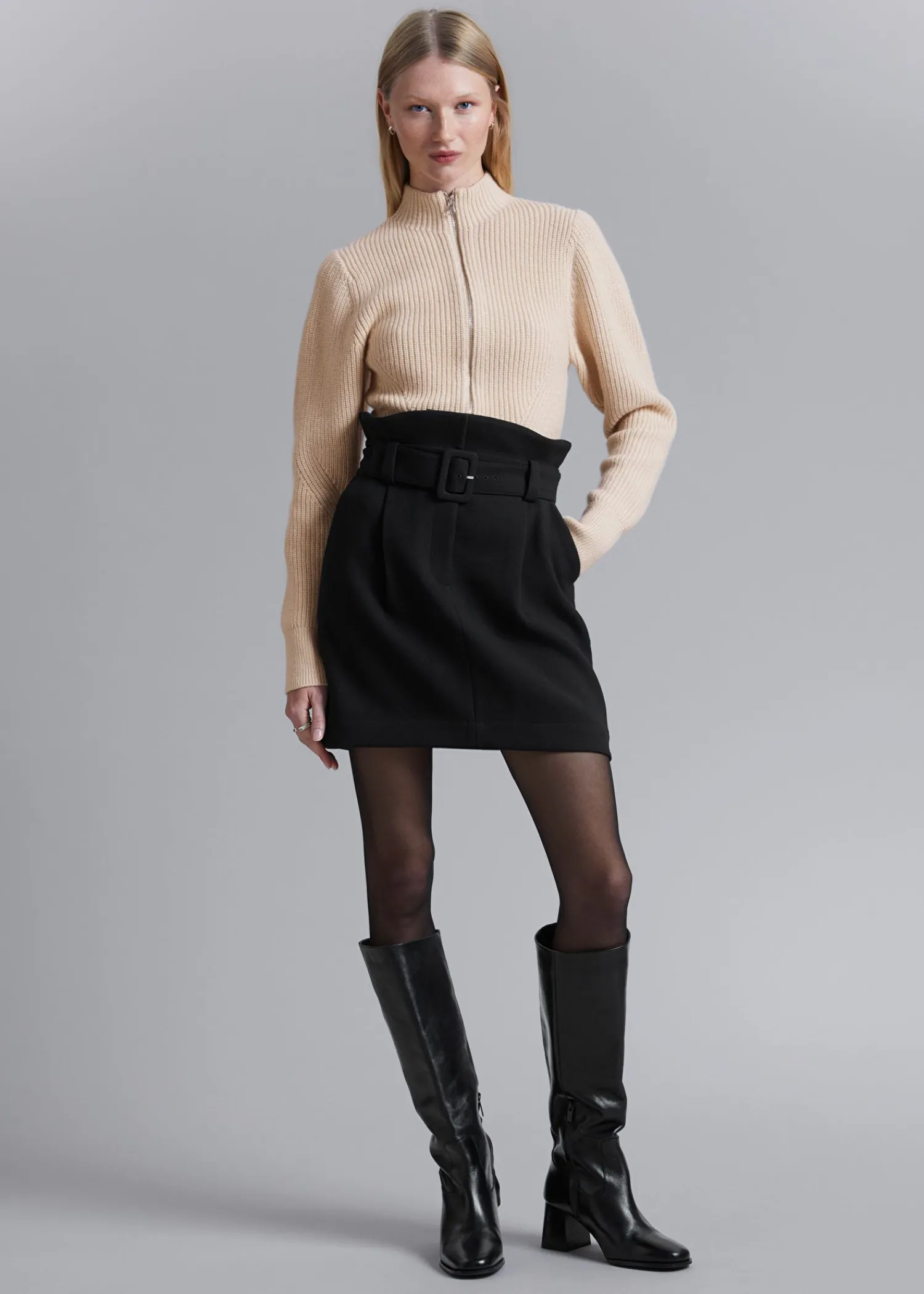 Mini-Nederdel Med En Paperbag-Talje Sikret Med Et Tonalt Spændebælte. Lynlåsgylp Med Krog- Og Stanglukning Bæltestropper Duo Stiklommer Duo Paspolerede Lommer Bagpå Længde På Nederdel: 42,5 Cm / 16,7″ (Eu 36 / Uk 8 / Us 4)