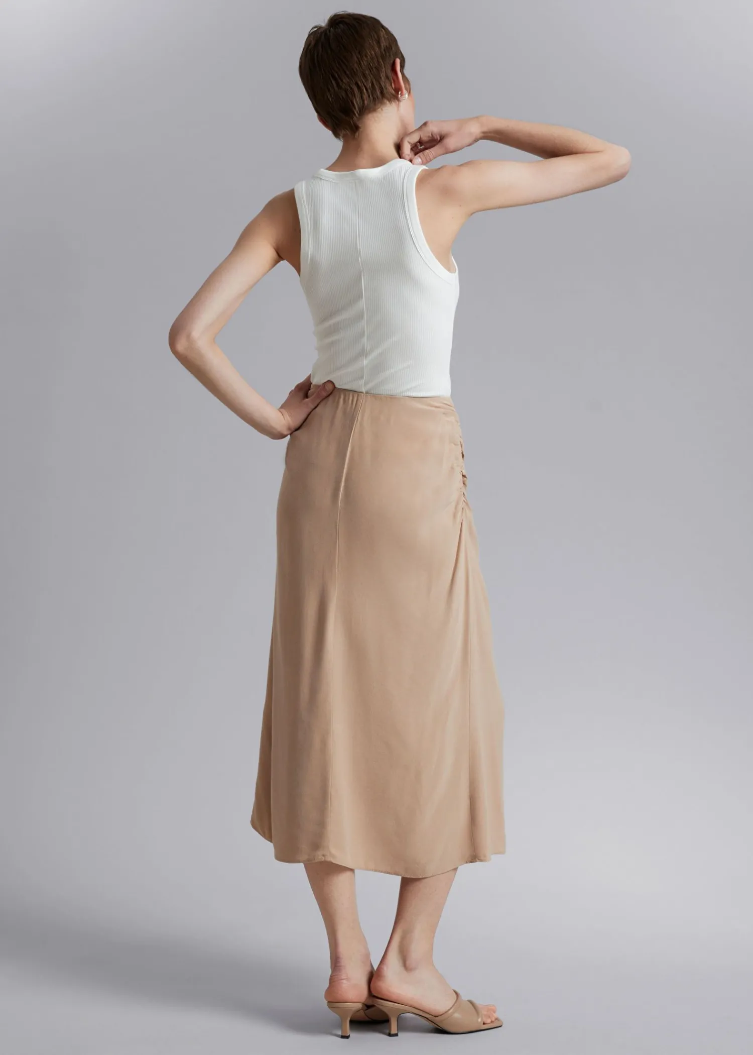 Rynket Midi-Nederdel Lavet Af Glat, Silkelignende Stof. Designet Med Høj Talje Accentueret Med Faste Rynker, Der Skaber…