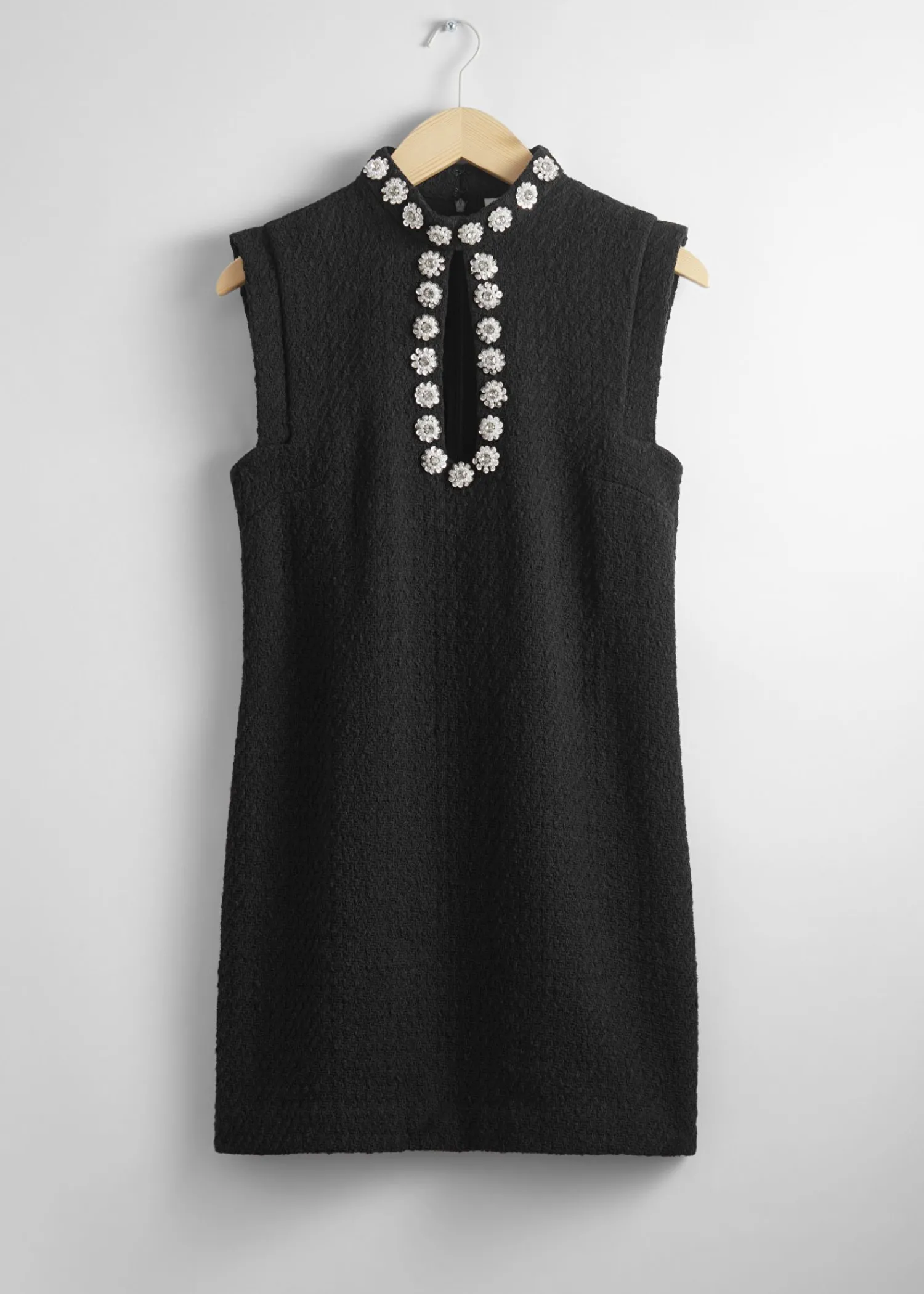 Ærmeløs A-Line Minikjole Prydet Med Blomstrede Rhinstensudsmykninger Ved Kraven Og Brystet. Fuldforet Mock-Hals Med Nøglehulsåbning Foran Lynlås I Siden Kjolens Længde: 83,5 Cm / 32,9″ (Eu 36 / Uk 8 / Us 4)