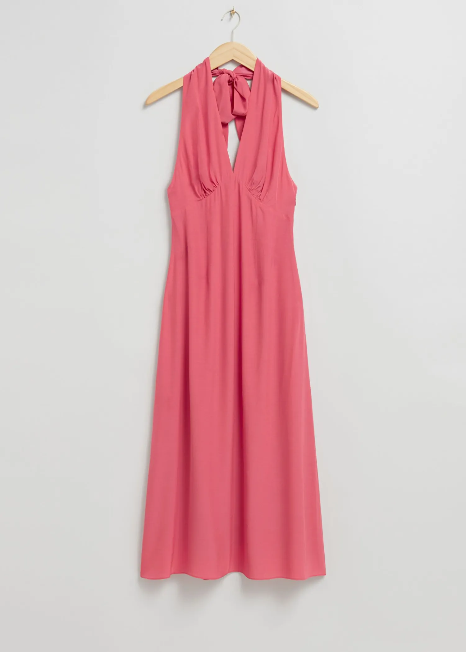 Halterneck Sløjfedetalje Blusset Kjole Lavet Af Silke-Lignende Vævet Voile. Designet Med En Dyb V-Udskæring Og Lavt Skåret Ryg Indrammet Med Tynde Bindebånd, Der Fastgør Rundt Om Halsen. Toppen Er Skræddersyet I En Figursyet Silhuet Med En Lang Flydende Nederdel. – Slim-Fit – Usynlig Sidesømslukning – Elastik Bagpå Længde På Kjolen: 99 Cm / 39″ (Eu 36 / Uk 8 / Us 4)
