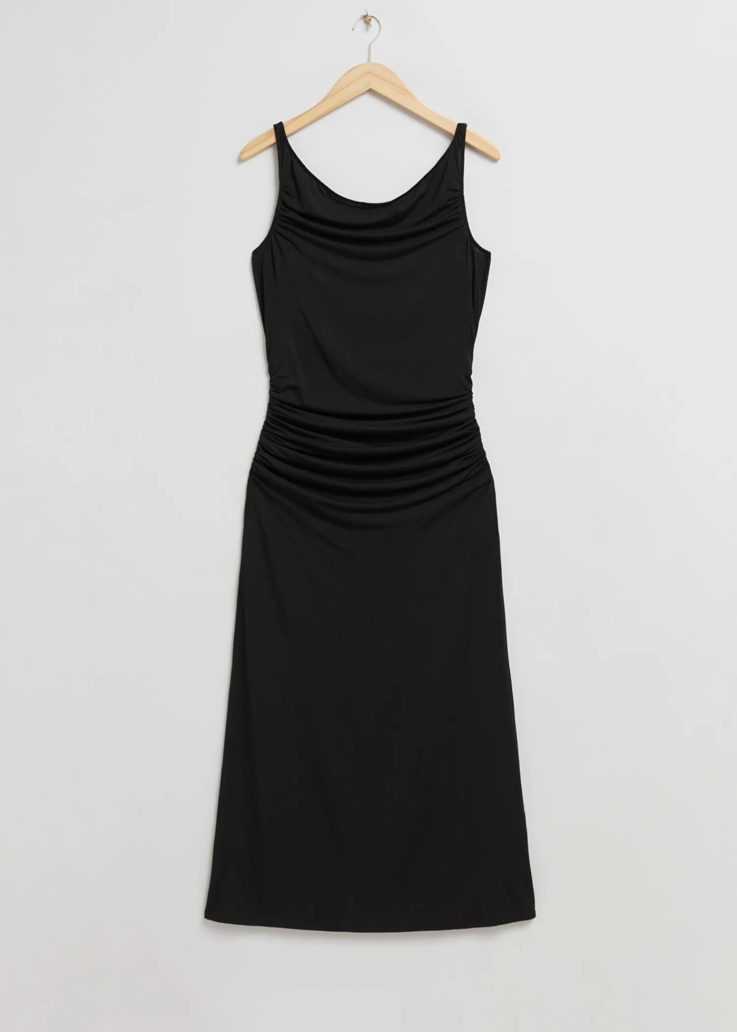 Midikjole Med Draperet Halsudskæring I Blød Jersey. Designet Med En Elegant Draperet Halsudskæring Og Rynket Talje Og Hofte, Hvilket Skaber En Blød Ruching, Der Fremhæver Figuren Og Giver Plads Til En Flydende Nederdel. – Slim Pasform, Halsudskæring – For- Og Bagside, Ruching I Taljen Og Hoften. Kjolens Længde: 138 Cm / 54,3 (Størrelse S) Luksuriøst Og Tilbagelænet Opsummerer Vores Looks Fra Los Angeles.