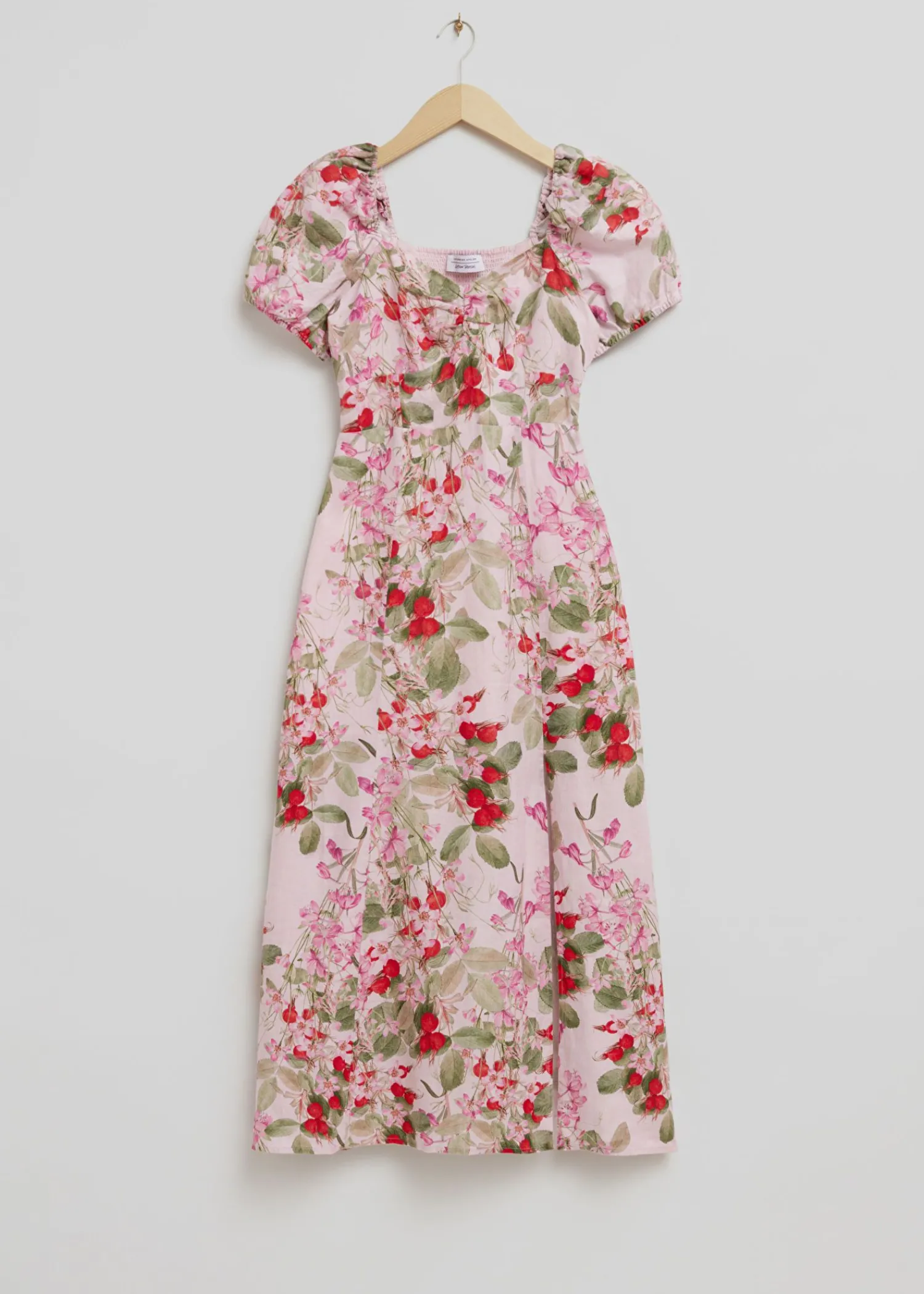 Midikjole Med Pufærmer Lavet Af Vævet Hør. Designet Med En Sweetheart-Udskæring, En Smocket Ryg Og En Slids I Siden, Skåret I En Figurnær Silhuet. – Slim Pasform – Foret – Skjult Sidelynlås Længde På Kjolen: 109 Cm / 42,9 (Eu 36 / Uk 10 / Us 4)