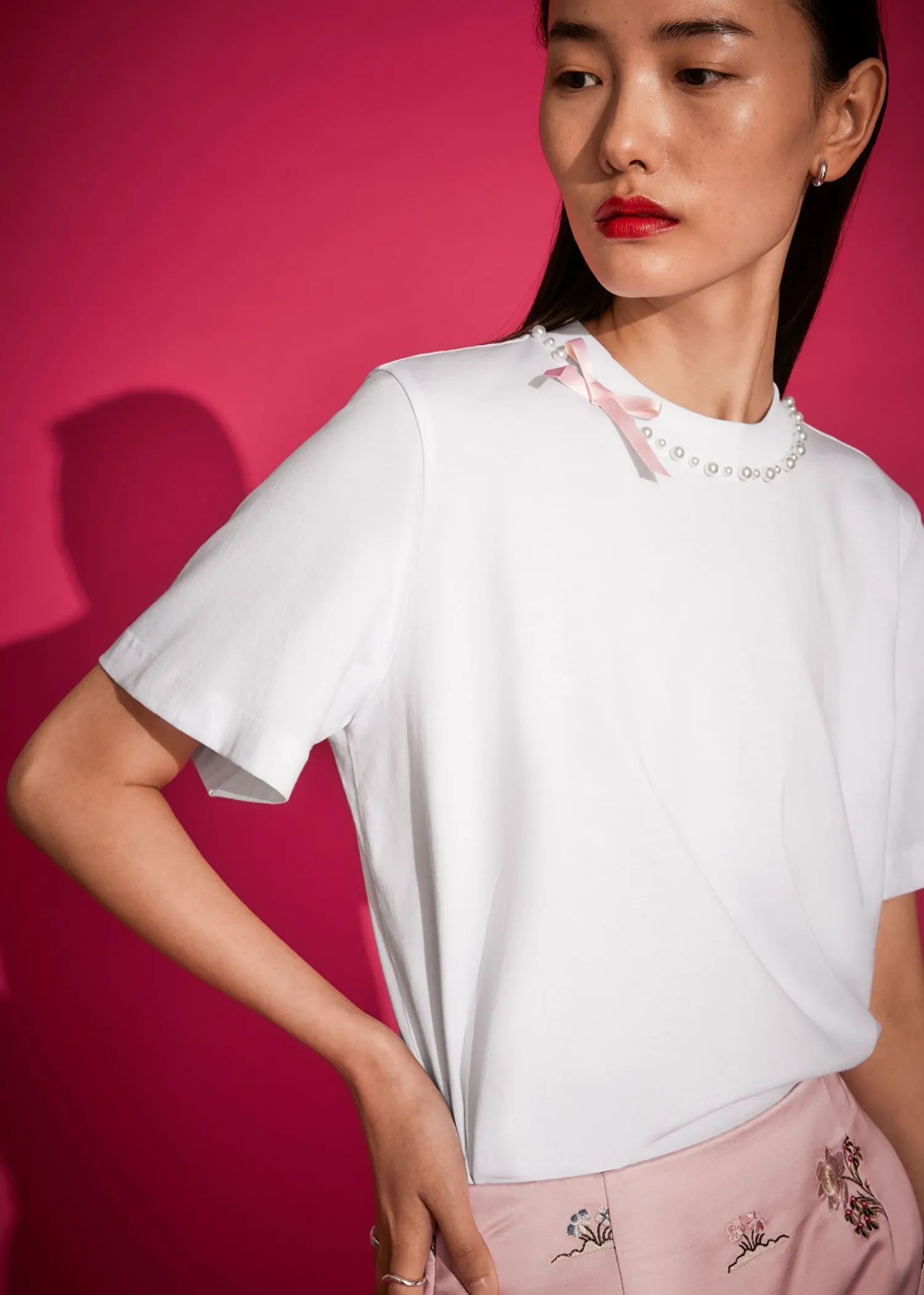 Afslappet T-Shirt Prydet Med Perleperler Og En Lille, Lækker Sløjfe I Nakken. Længde På T-Shirt: 58 Cm / 22,8″ (Størrelse S)