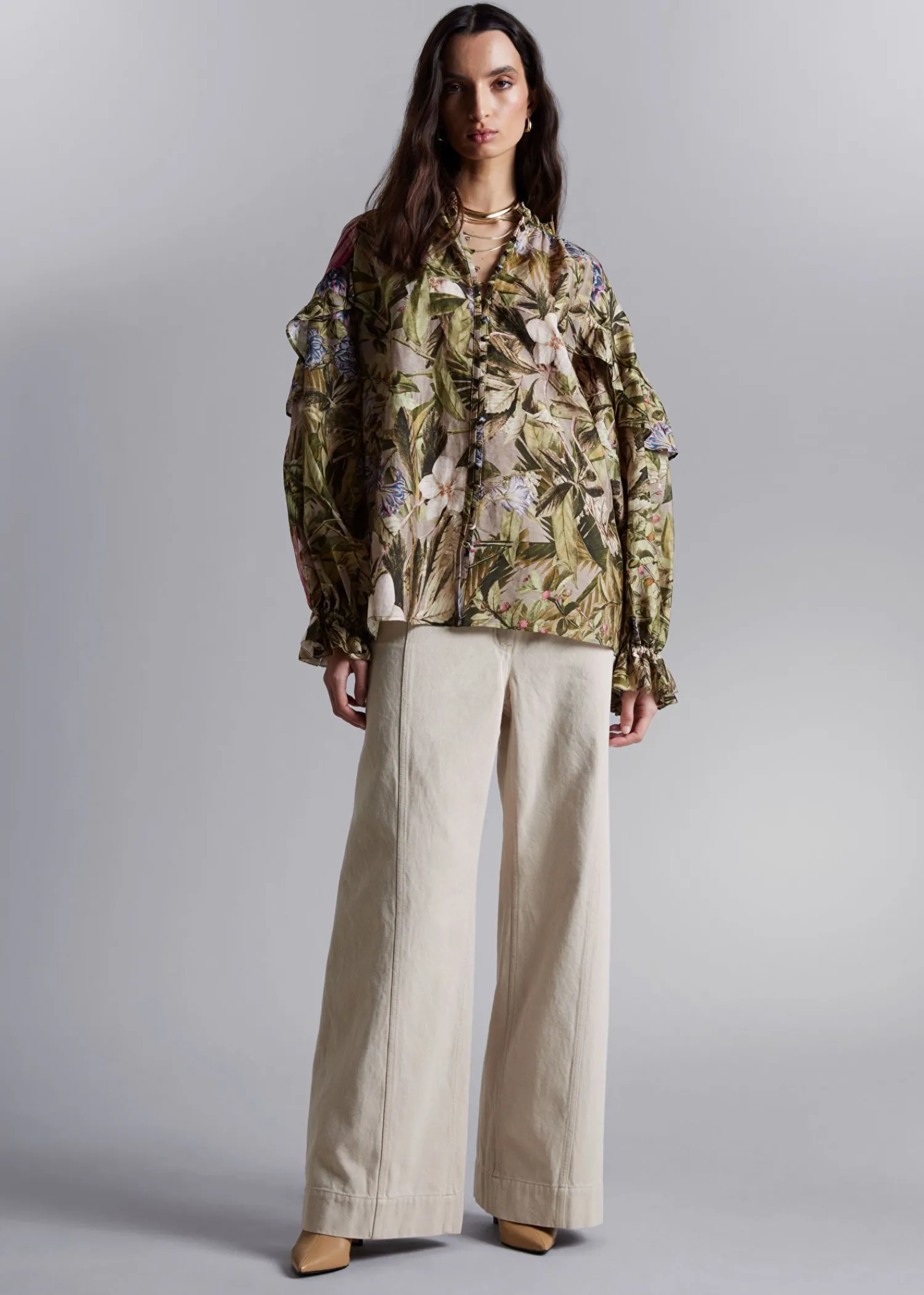 Voluminøs Bluse Med Knapper Med Flæsedetaljer Langs Ærmerne. Afslappet Pasform Flæsehalsudskæring Og Manchetter Rag…