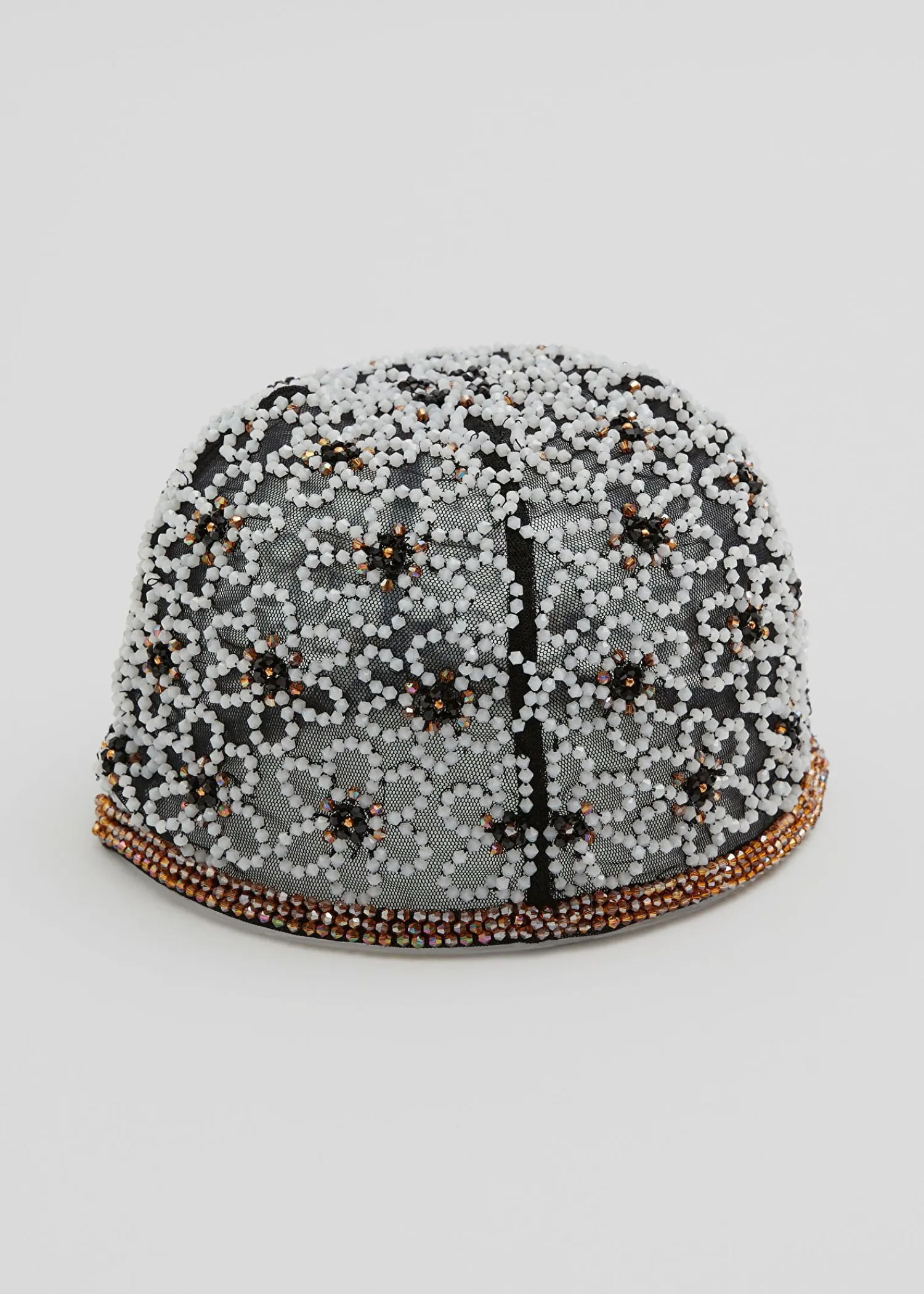 Glasperle-Udsmykket Hovedstykke Med Et Delikat, Broderet Design. Afsluttet Med Et Blomstermotiv, Sat På En Skulptureret Mesh-Hjelm.