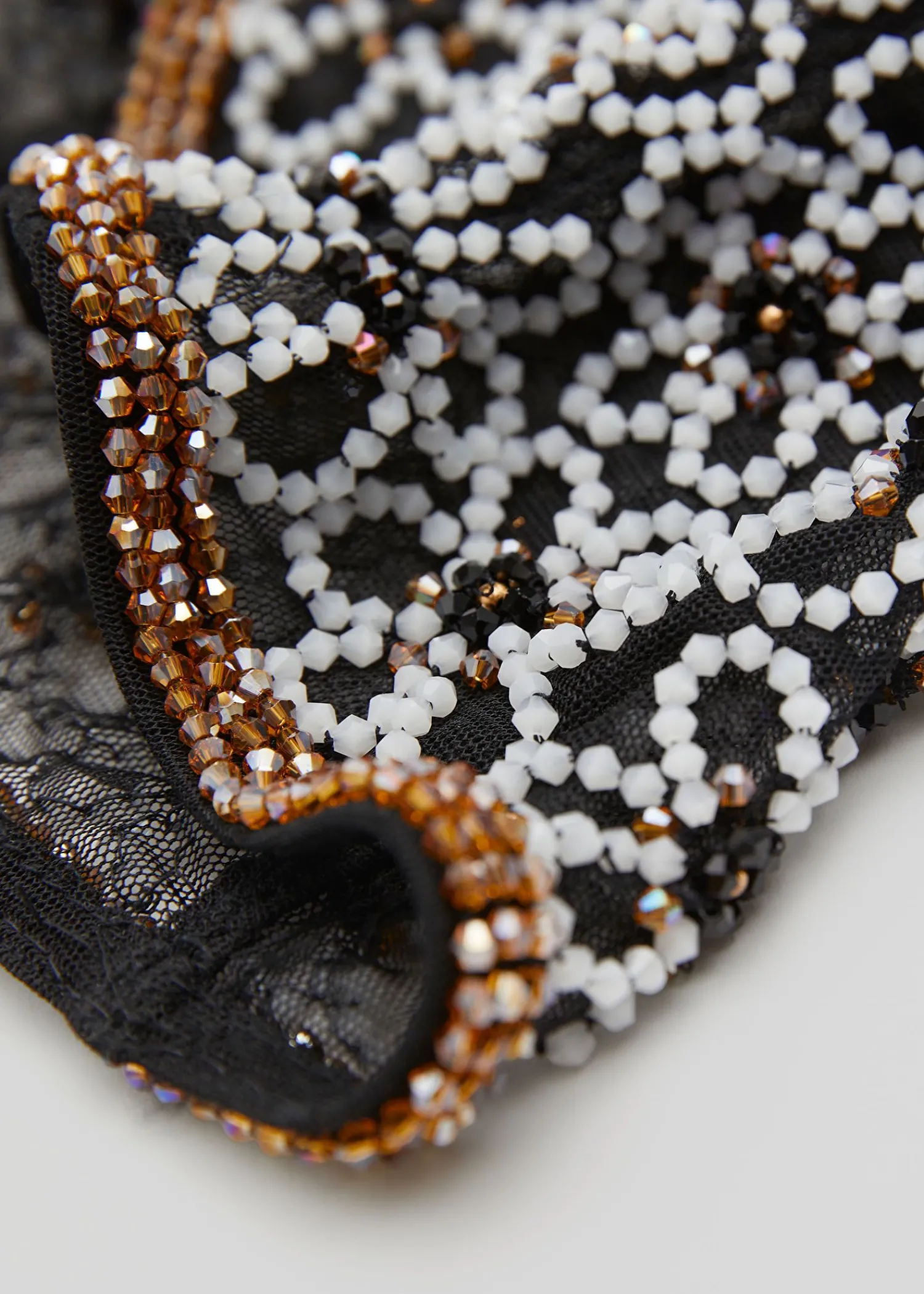 Glasperle-Udsmykket Hovedstykke Med Et Delikat, Broderet Design. Afsluttet Med Et Blomstermotiv, Sat På En Skulptureret…