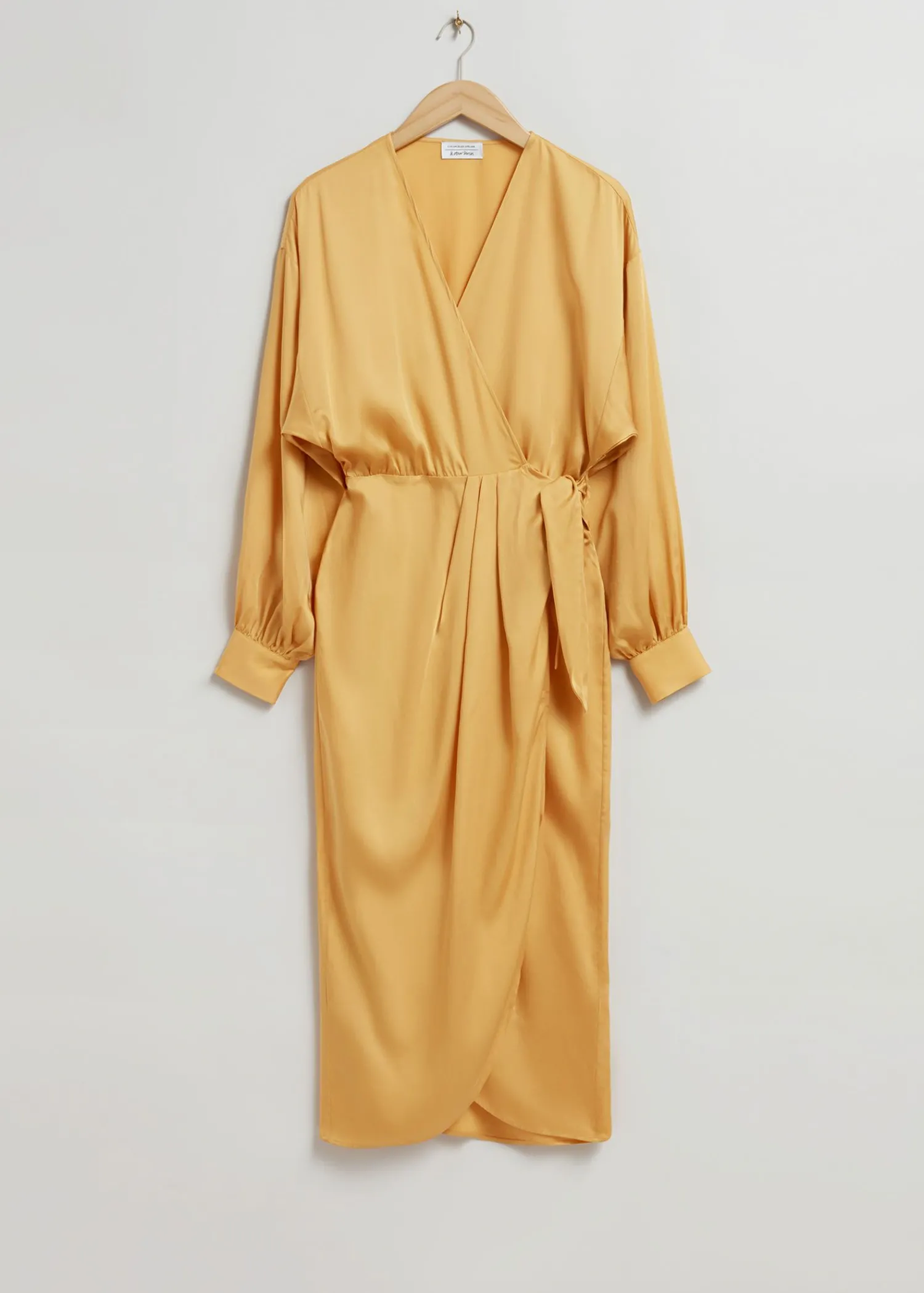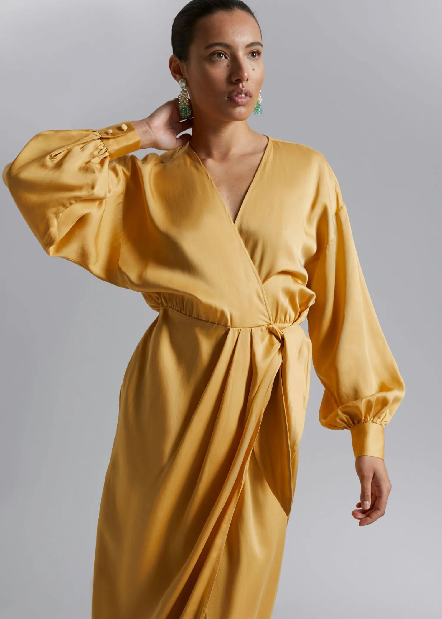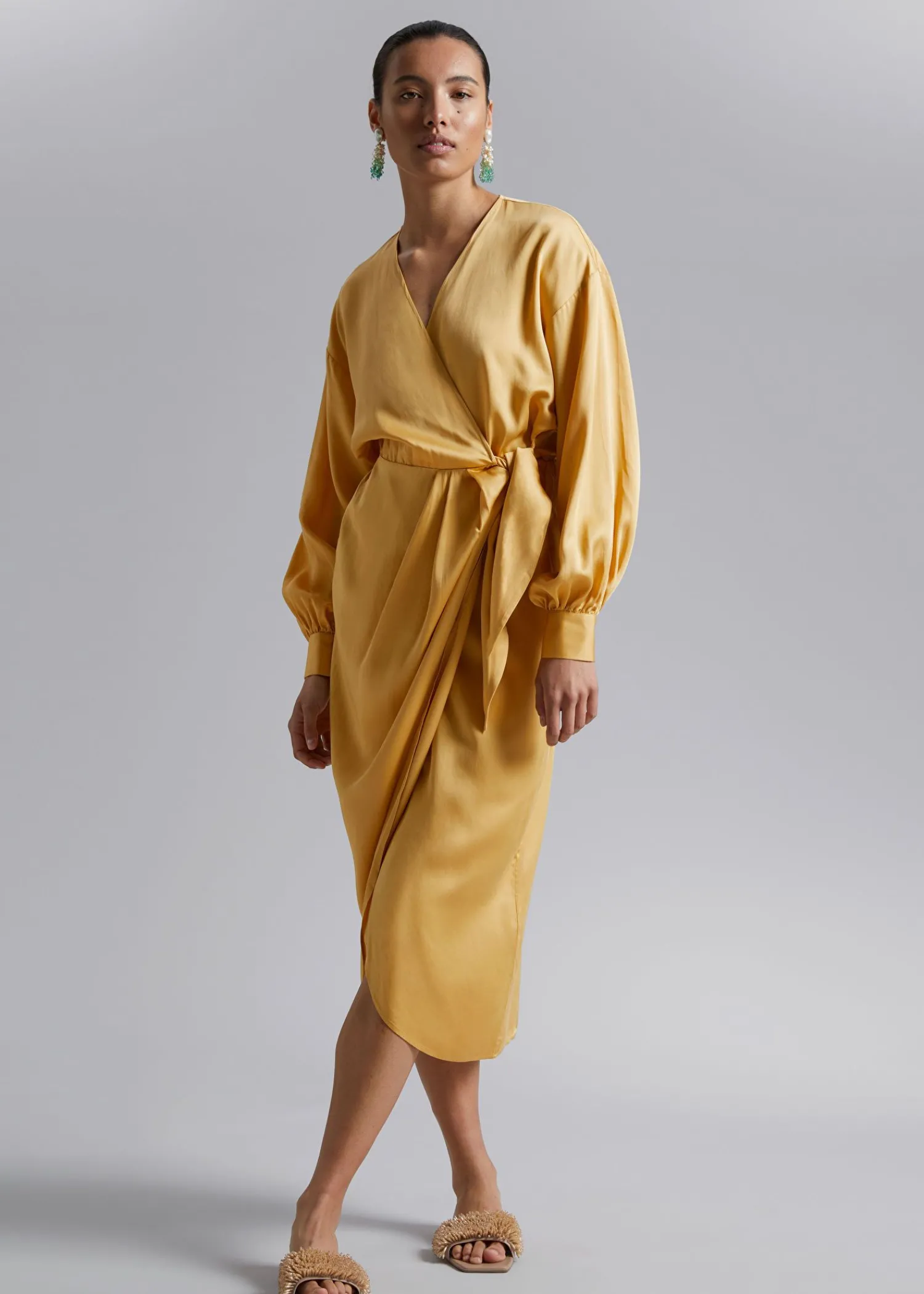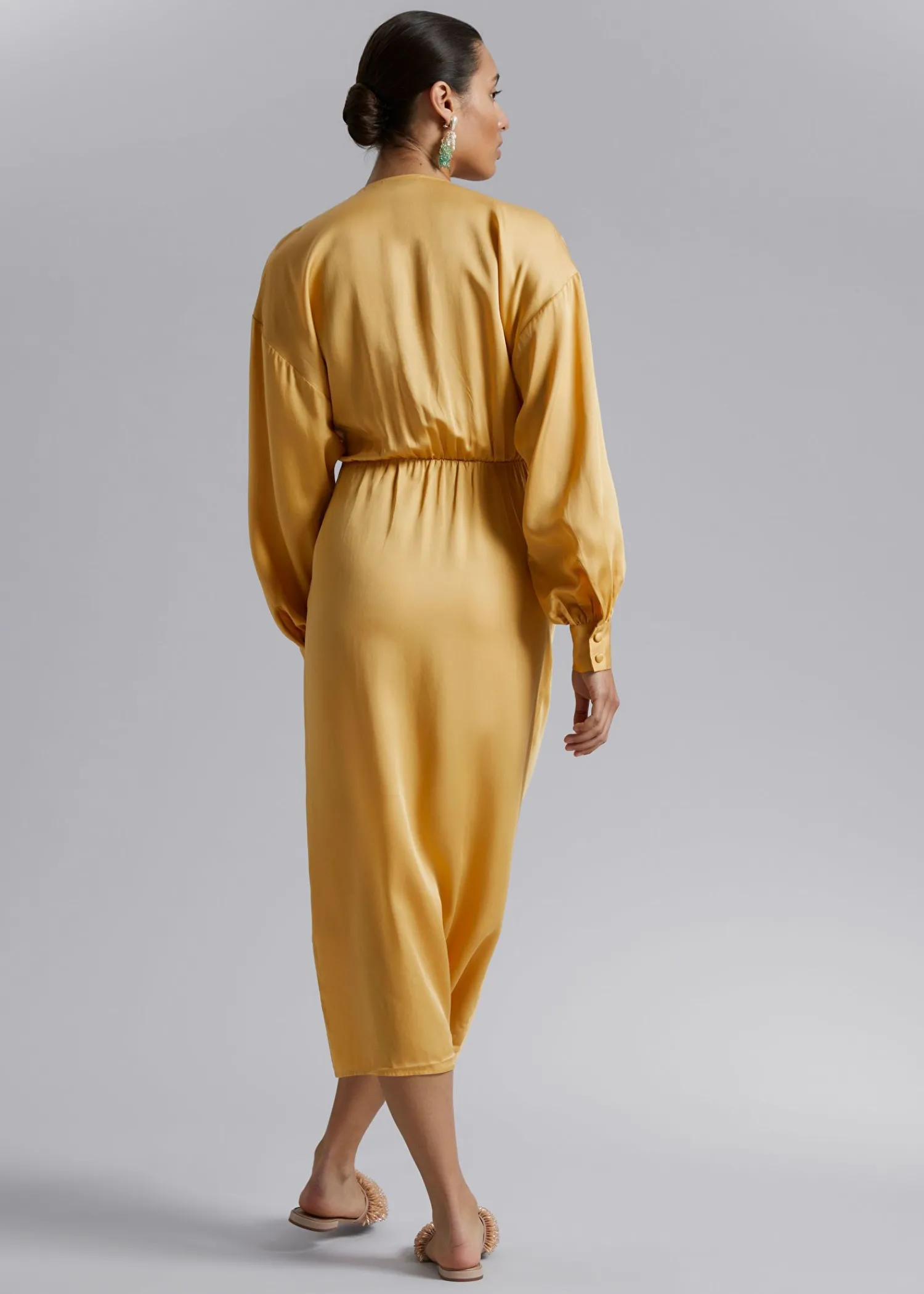 Omslagskjole Med V-Udskæring Lavet Af Blødt, Silkeagtigt Tekstureret Stof. Designet Med Lange Voluminøse Blousonærmer Og En Justerbar Slå-Om-Talje Med En Draperet Nederdel Med En Afrundet Tulipankant I Midi-Længde. – Normal Pasform – Elastik I Taljen – Manchetter Med Knapper Længde På Kjolen: 132 Cm / 52″ (Eu 36 / Uk 8 / Us 4) Luksuriøst Og Tilbagelænet Opsummerer Vores Looks Fra Los Angeles.