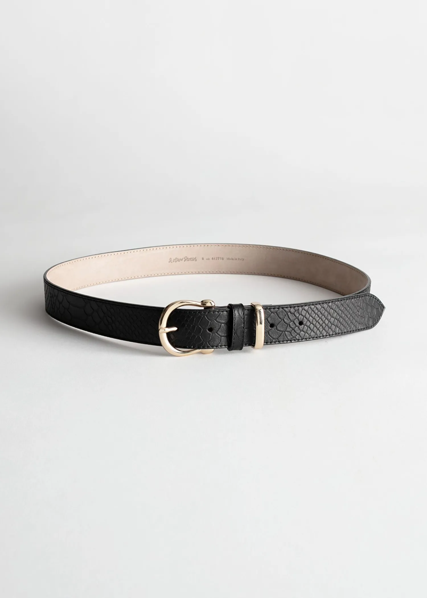 Dette Slanke Læderbælte Er Struktureret Med Slangepræget Mønster Og Har En Metallisk Spand Og Løkke. Har To Løkker I Metallic Og Læder