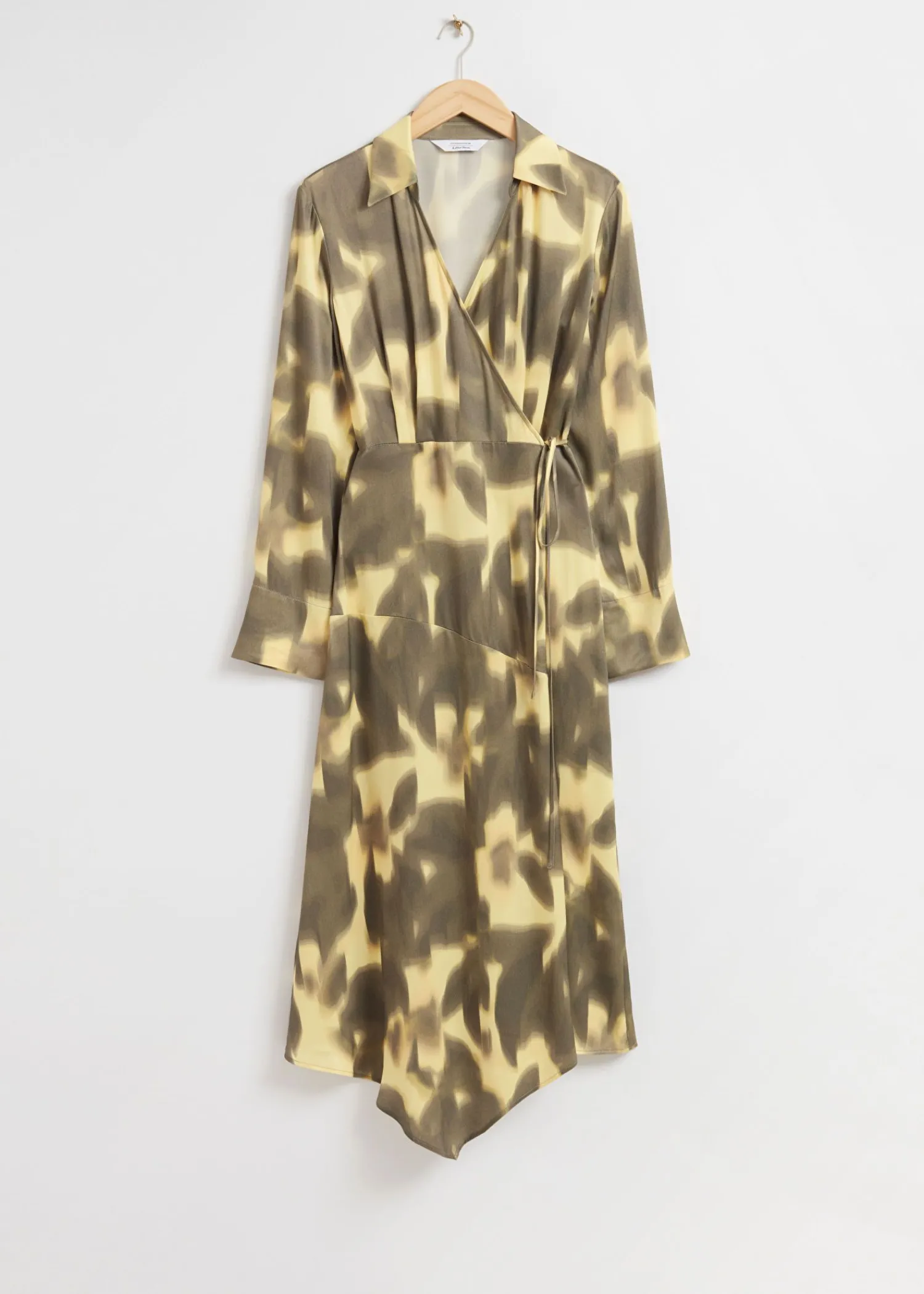 Omslagskjole I Midi, Lavet Af Satin. Med En Asymmetrisk Kant Og Spagetti Bindebånd I Taljen, Bundet Bagpå. Lange Ærme…