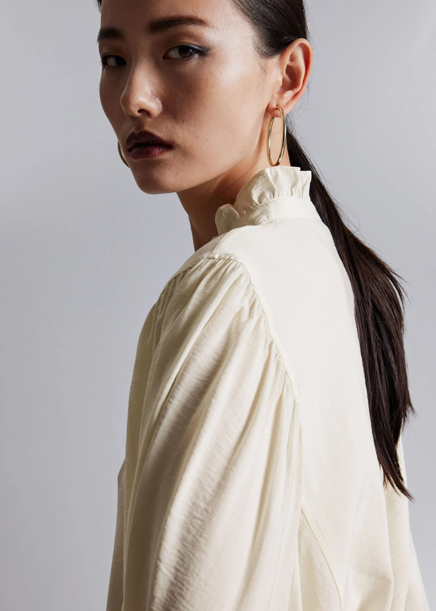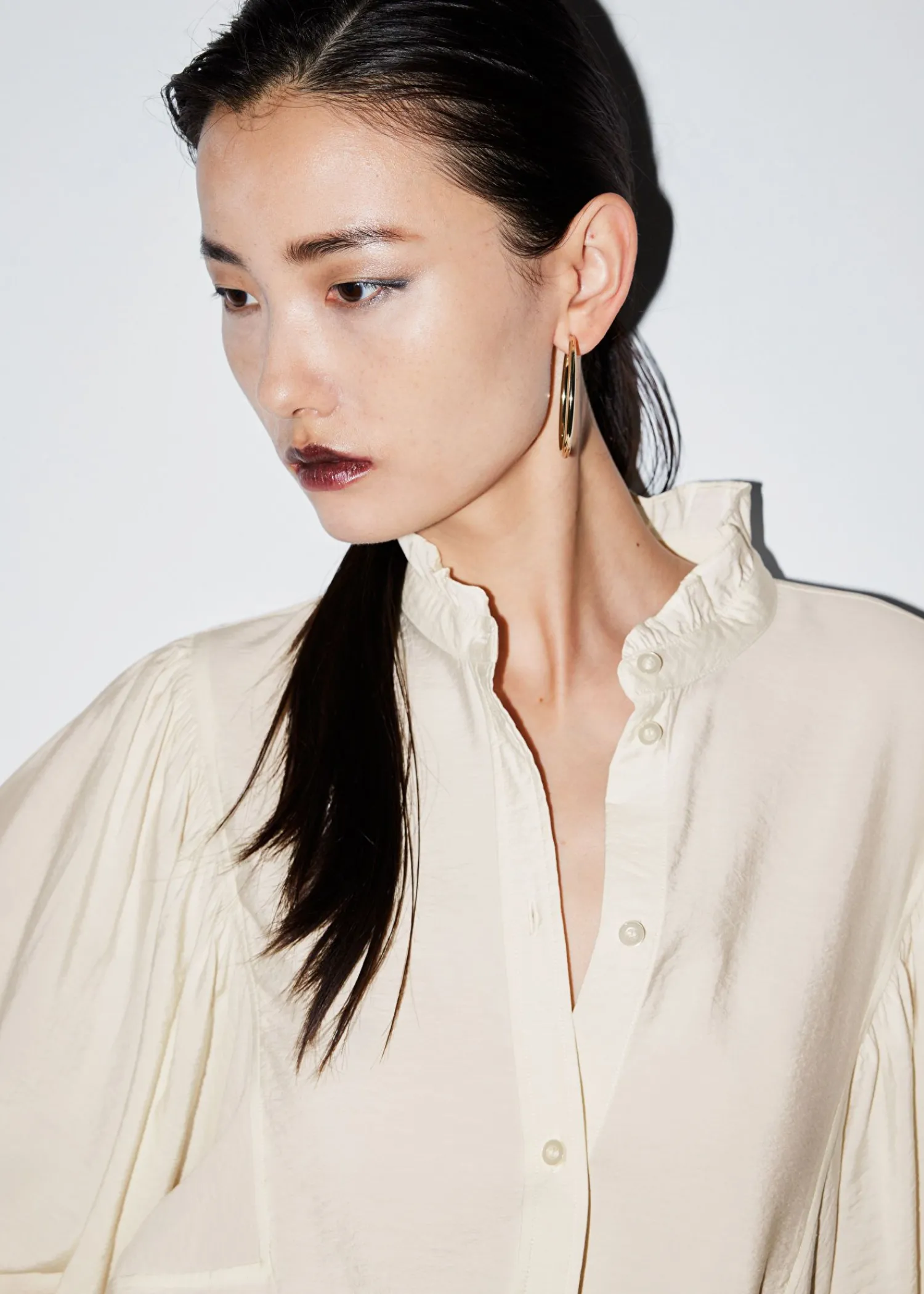 Bluse Med Knapper Med Høj Flæsekrave Og Lange Afslappede Ærmer. Syv Knaplukninger I Midten Foran Knappede Manchetter Længde På Bluse: 67,5 Cm / 26,6″ (Størrelse S)
