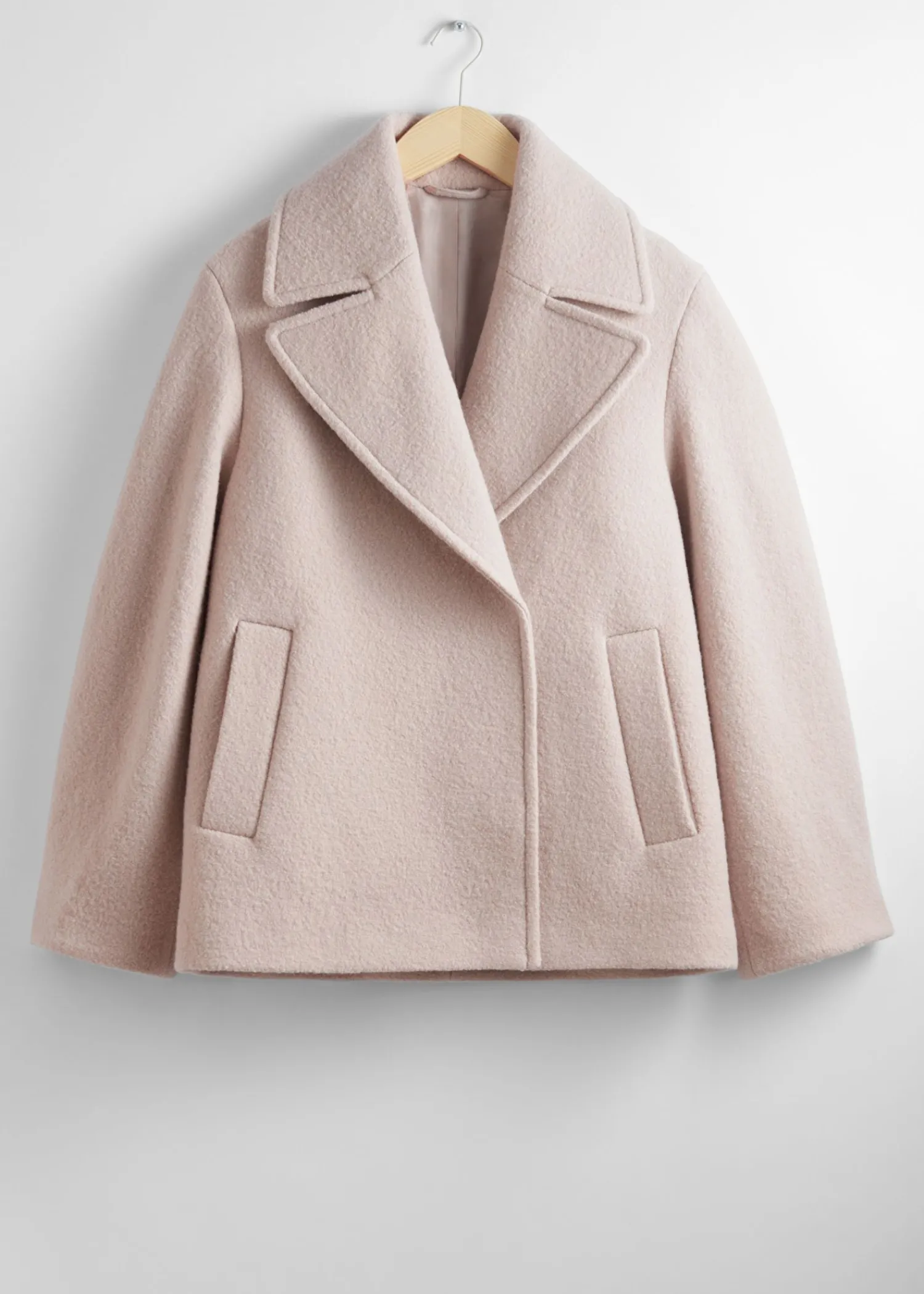 Dobbeltradet Uldjakke Designet Med En Stor Reverskrave Med Hak Og V-Udskæring. Normal Pasform, Korte Lodrette Paspolere…