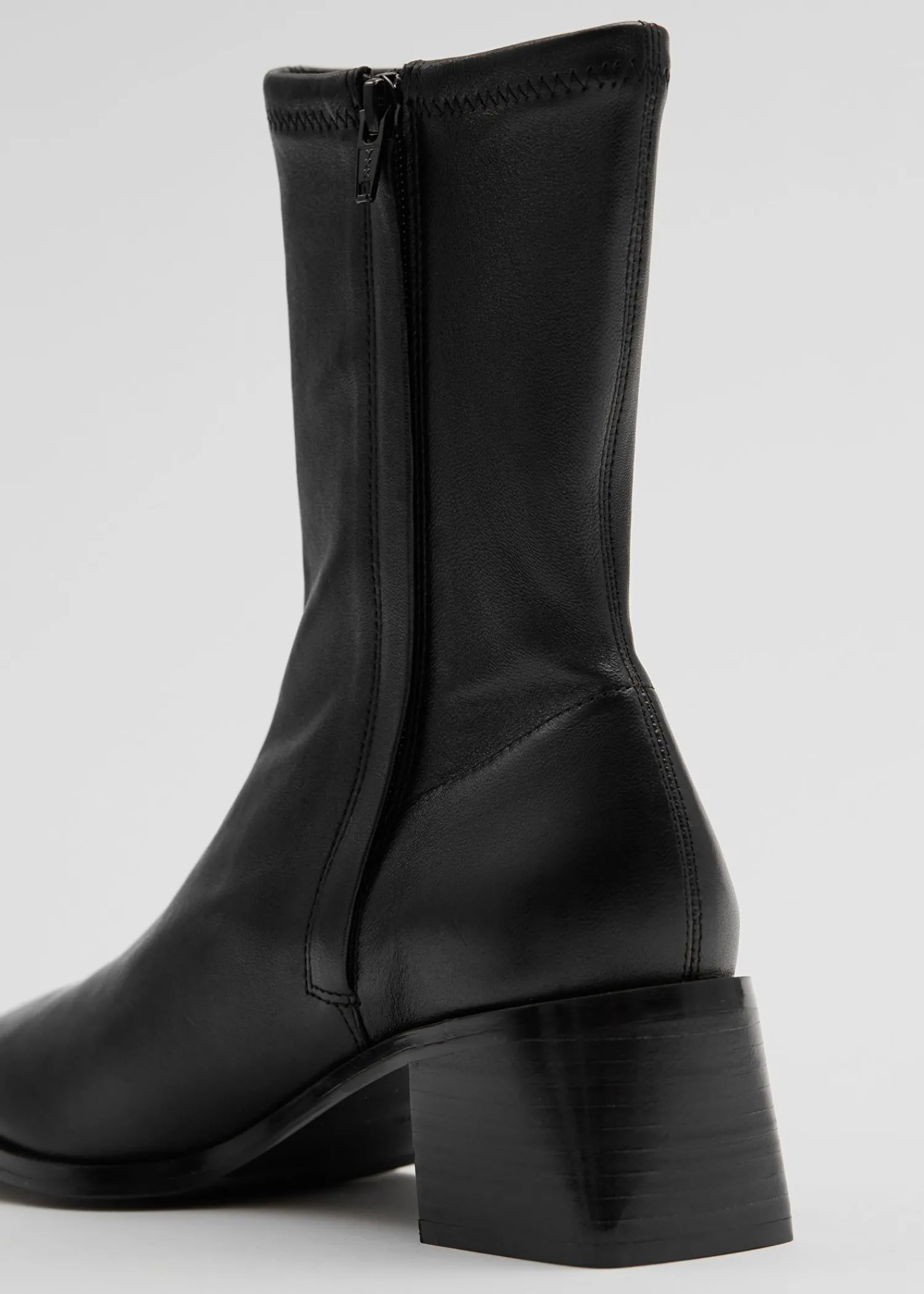 Lædersokkestøvler Med Firkantede Tåer Med Topsyede Midtersømme, Tykke Blokhæle Og Skjulte Lynlåse I Siden. Hælhøjde: 5 Cm / 1,9″
