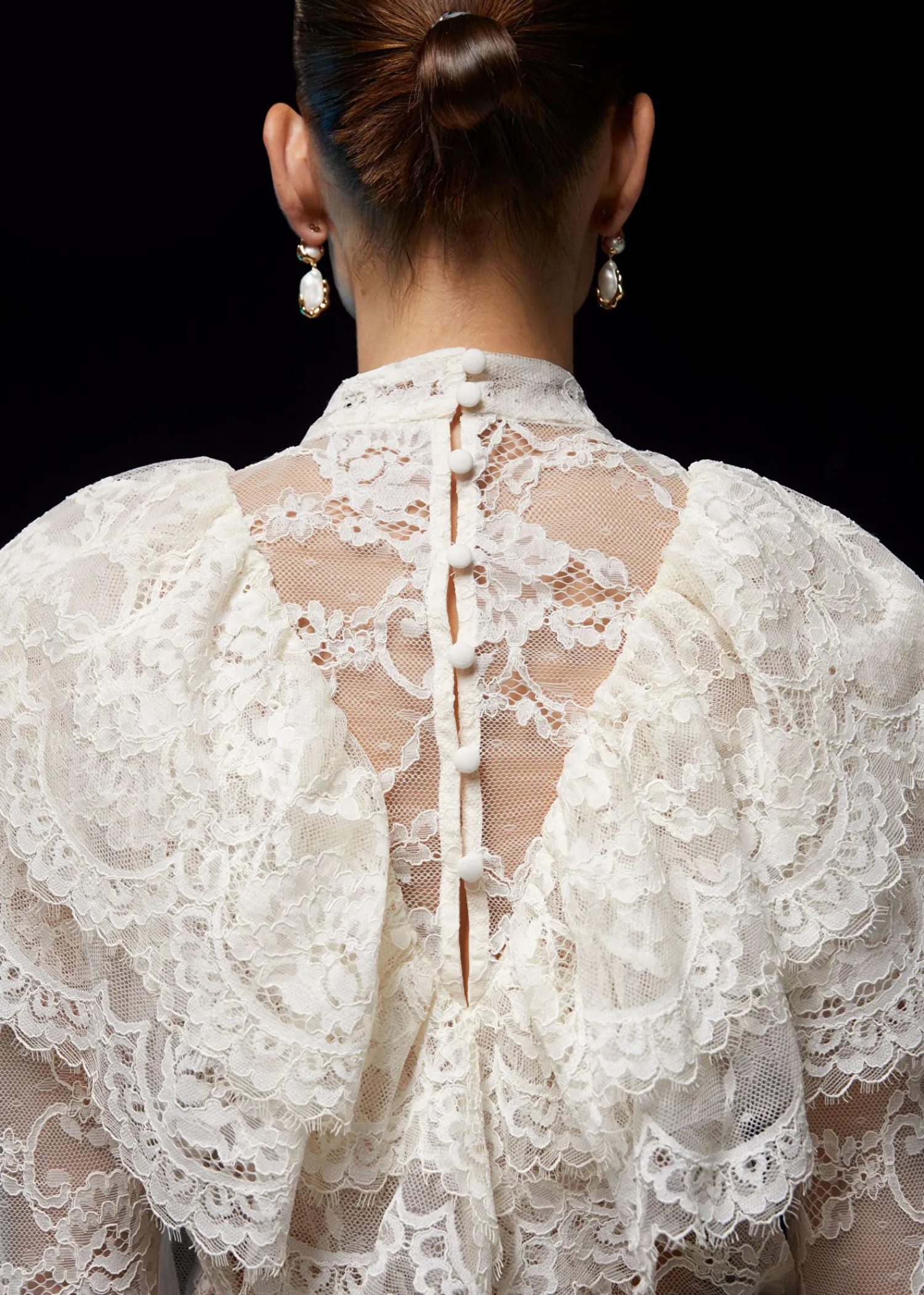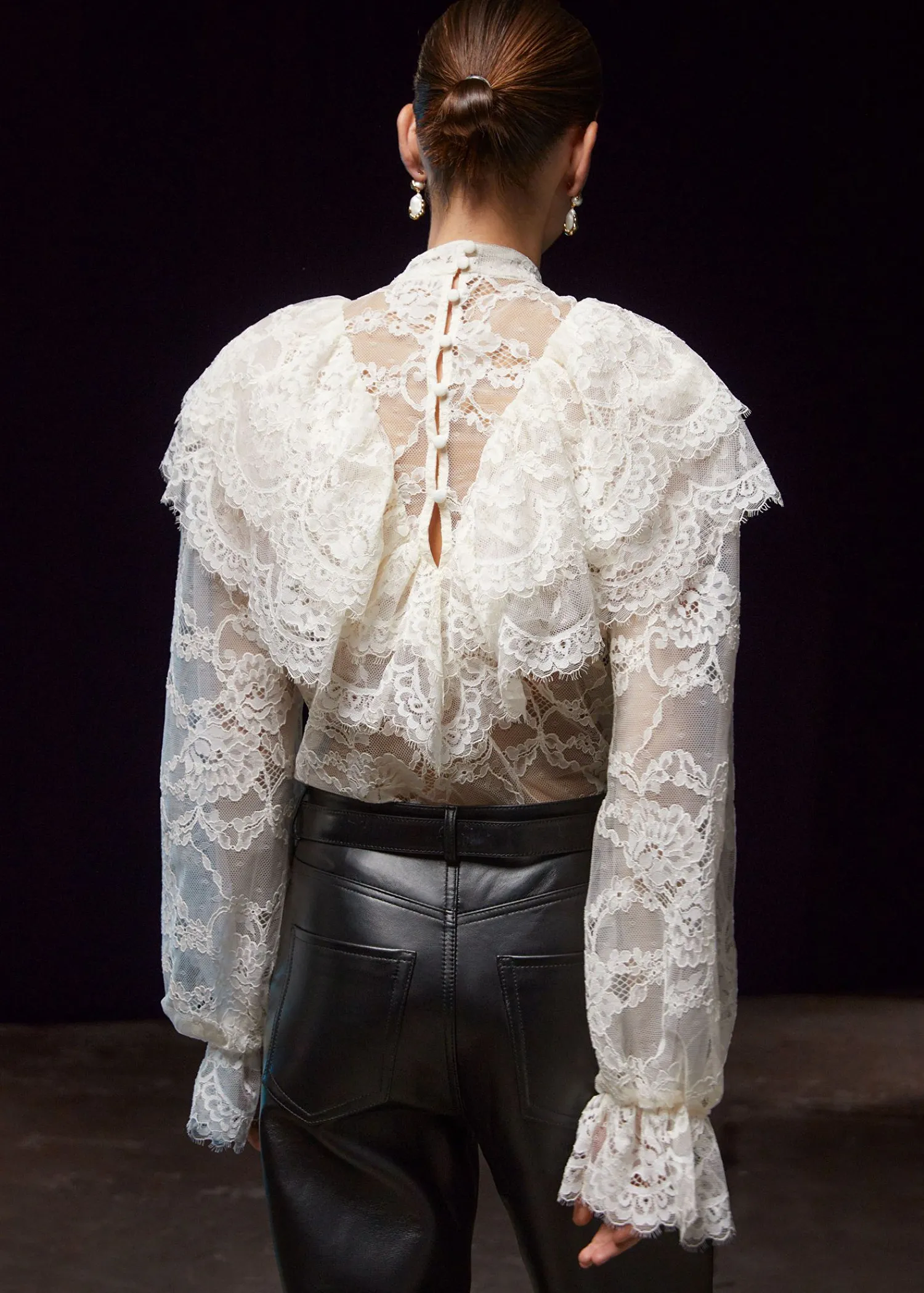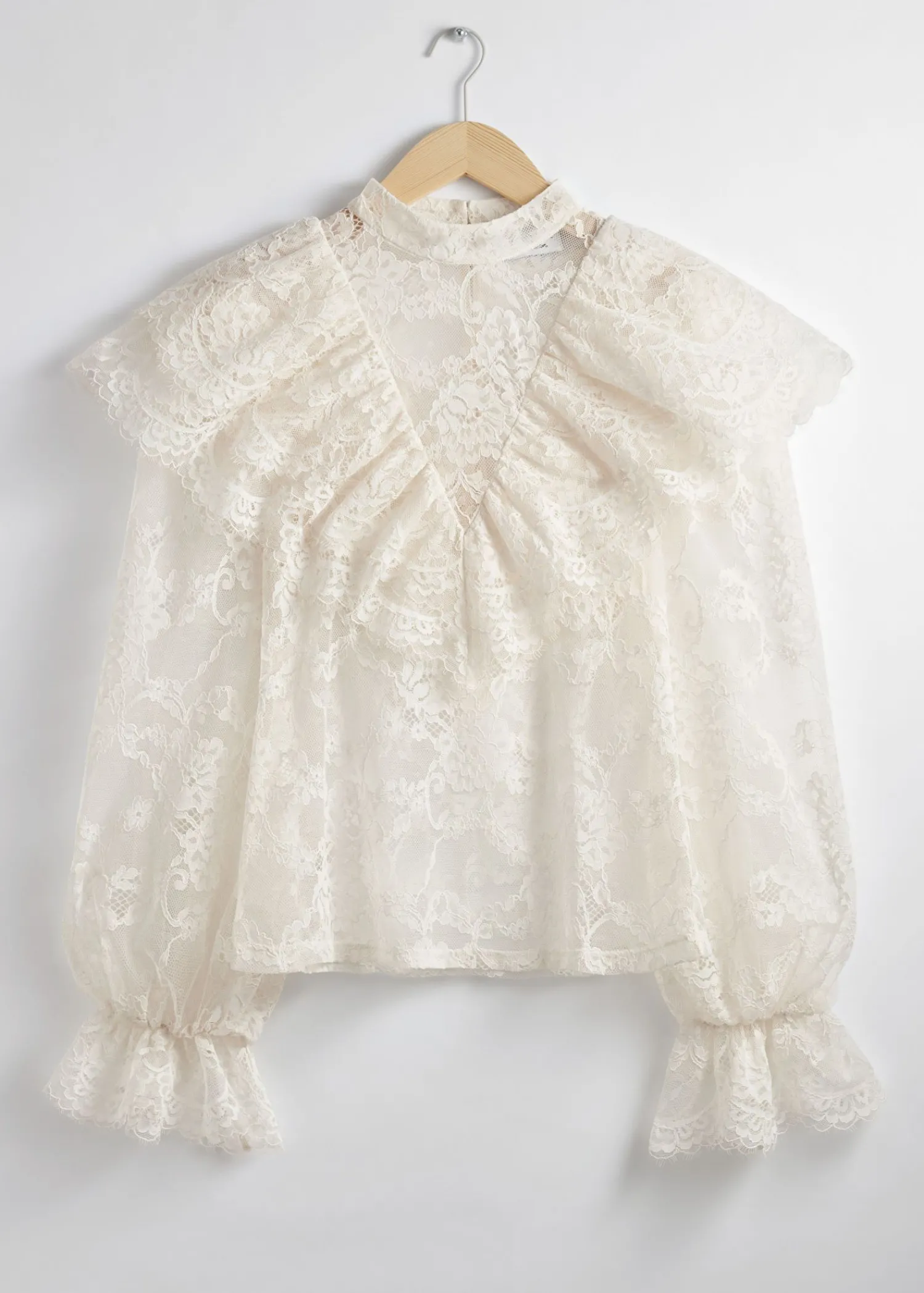 Blondebluse Med Flæser Efter Skuldrene Og Voluminøse Ærmer Med Flæsede Manchetter. Slim Pasform Skærmede Detaljer Ved Flæserne Mock-Hals Med Knaplukninger I Halsen Længde På Blusen: 60 Cm / 23,6″ (Eu 36 / Uk 8 / Us 4)