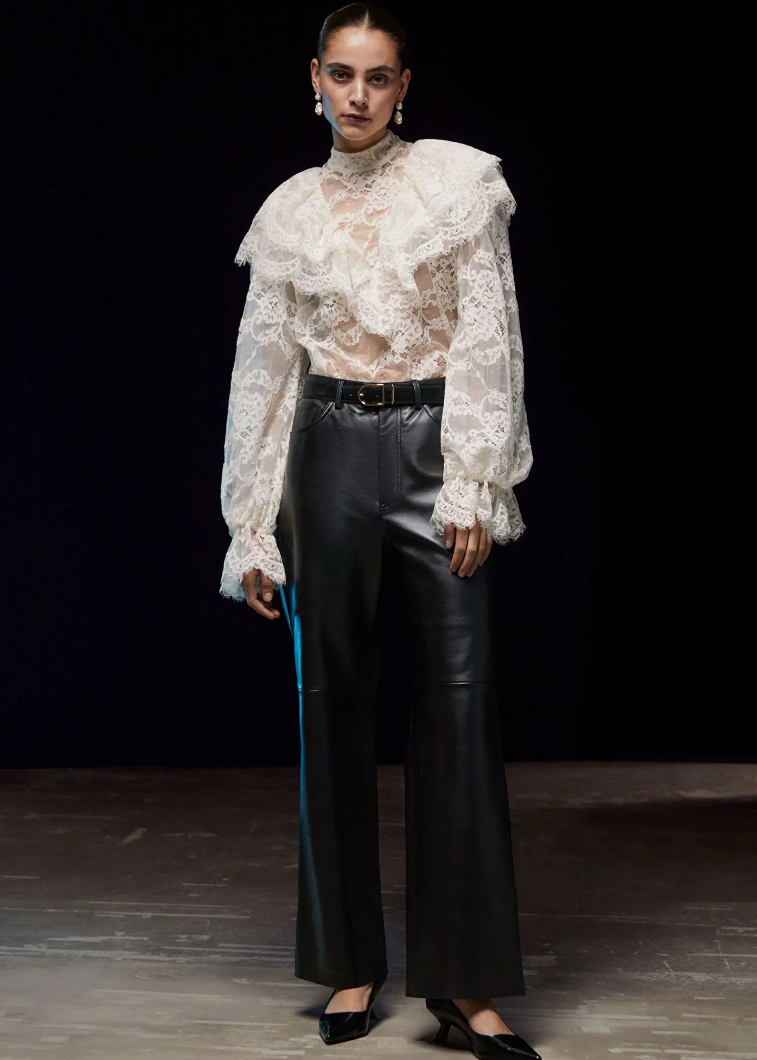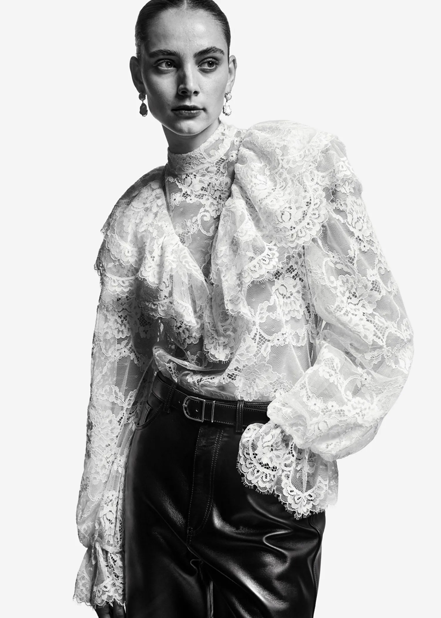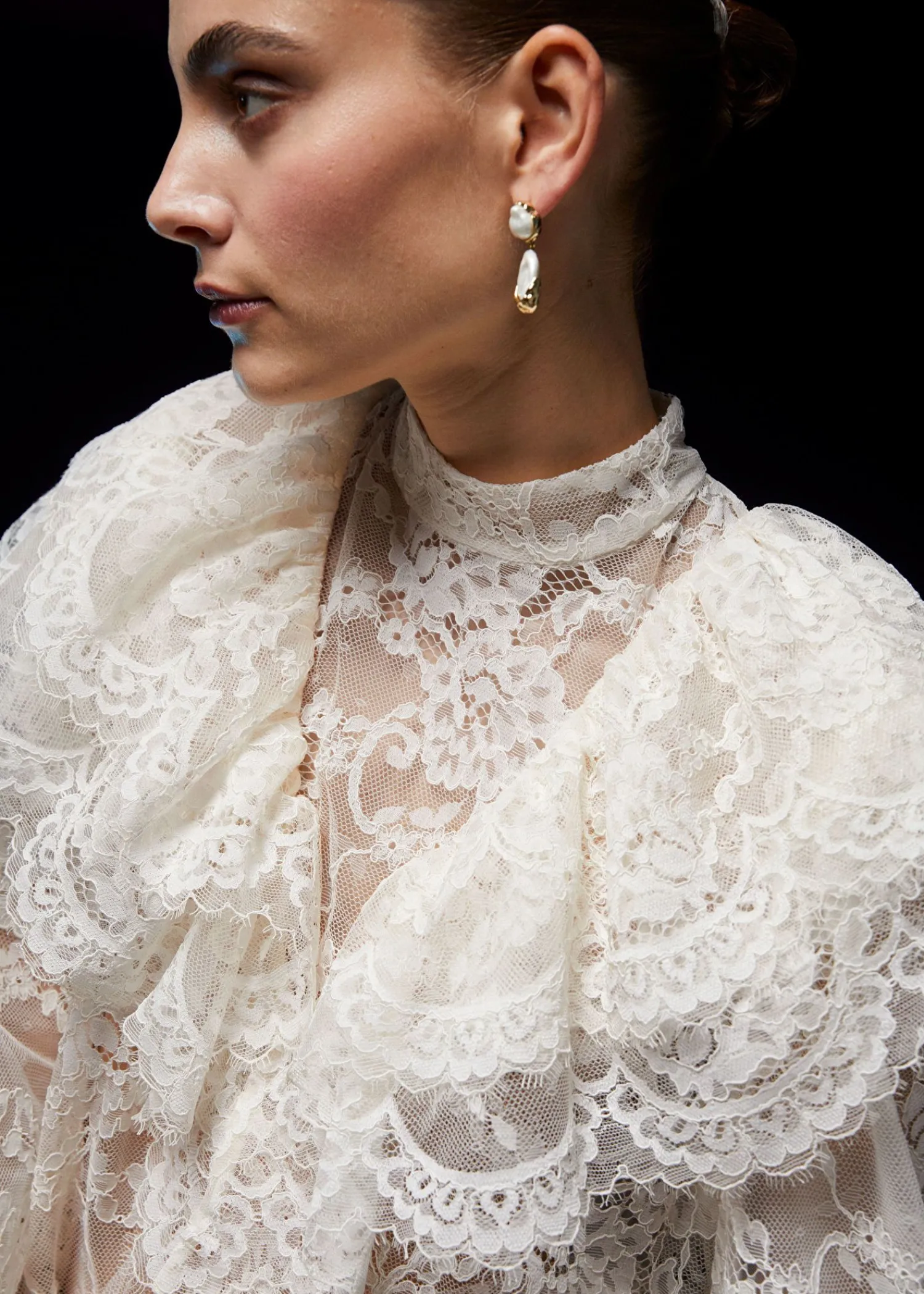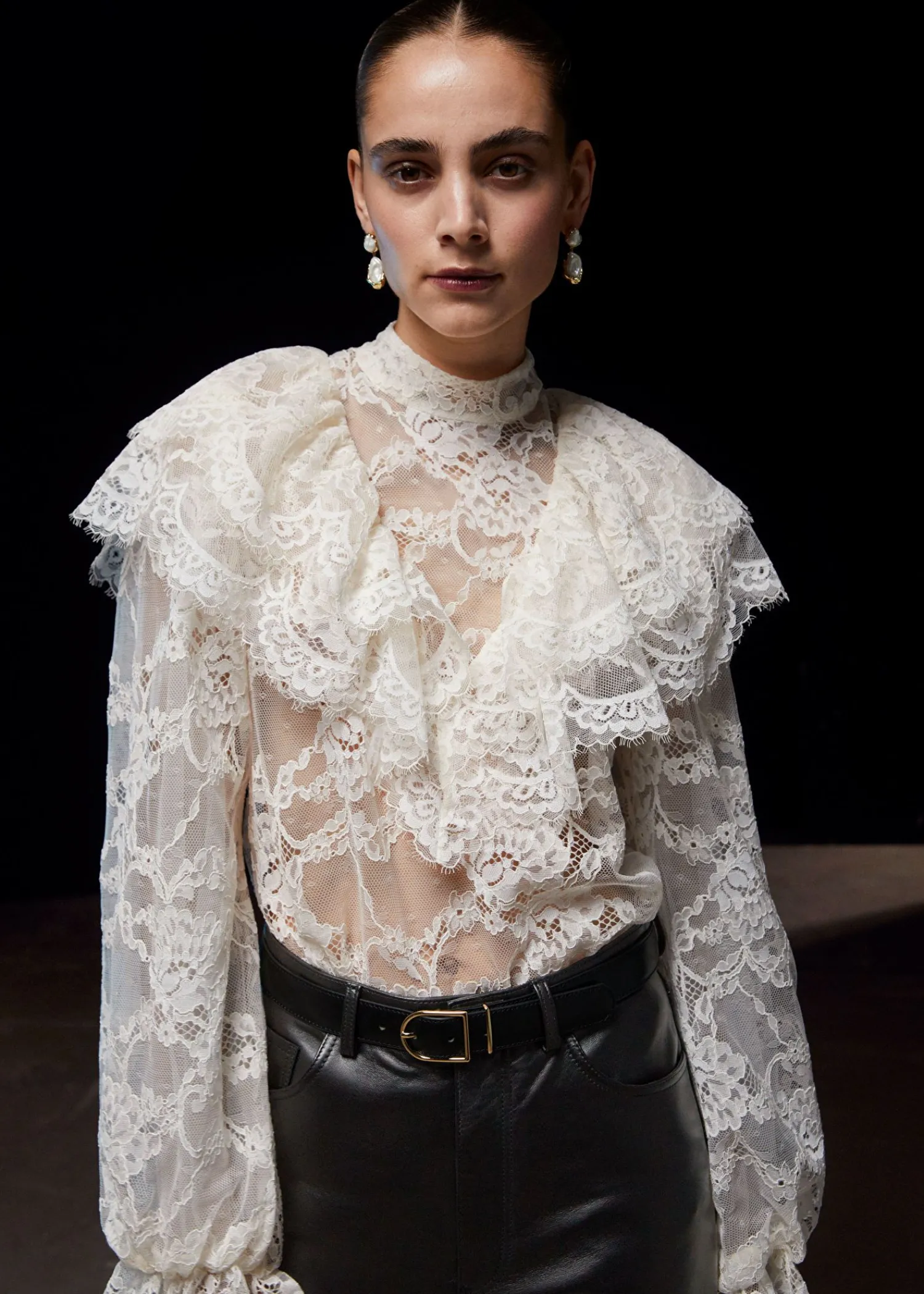 Blondebluse Med Flæser Efter Skuldrene Og Voluminøse Ærmer Med Flæsede Manchetter. Slim Pasform Skærmede Detaljer Ved Flæserne Mock-Hals Med Knaplukninger I Halsen Længde På Blusen: 60 Cm / 23,6″ (Eu 36 / Uk 8 / Us 4)