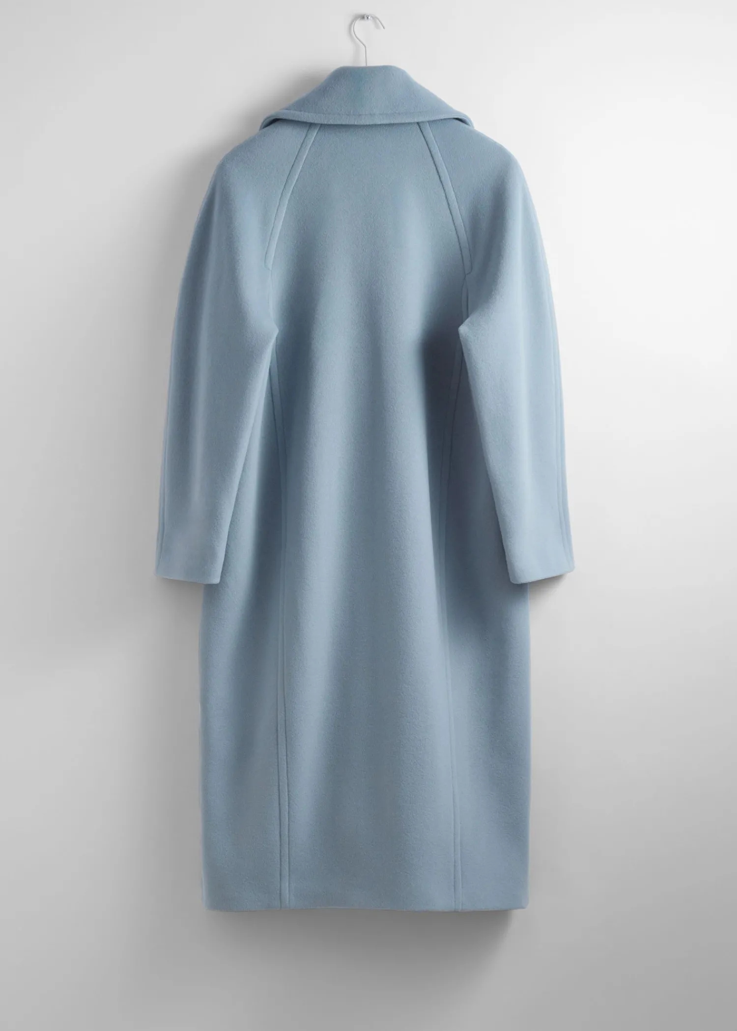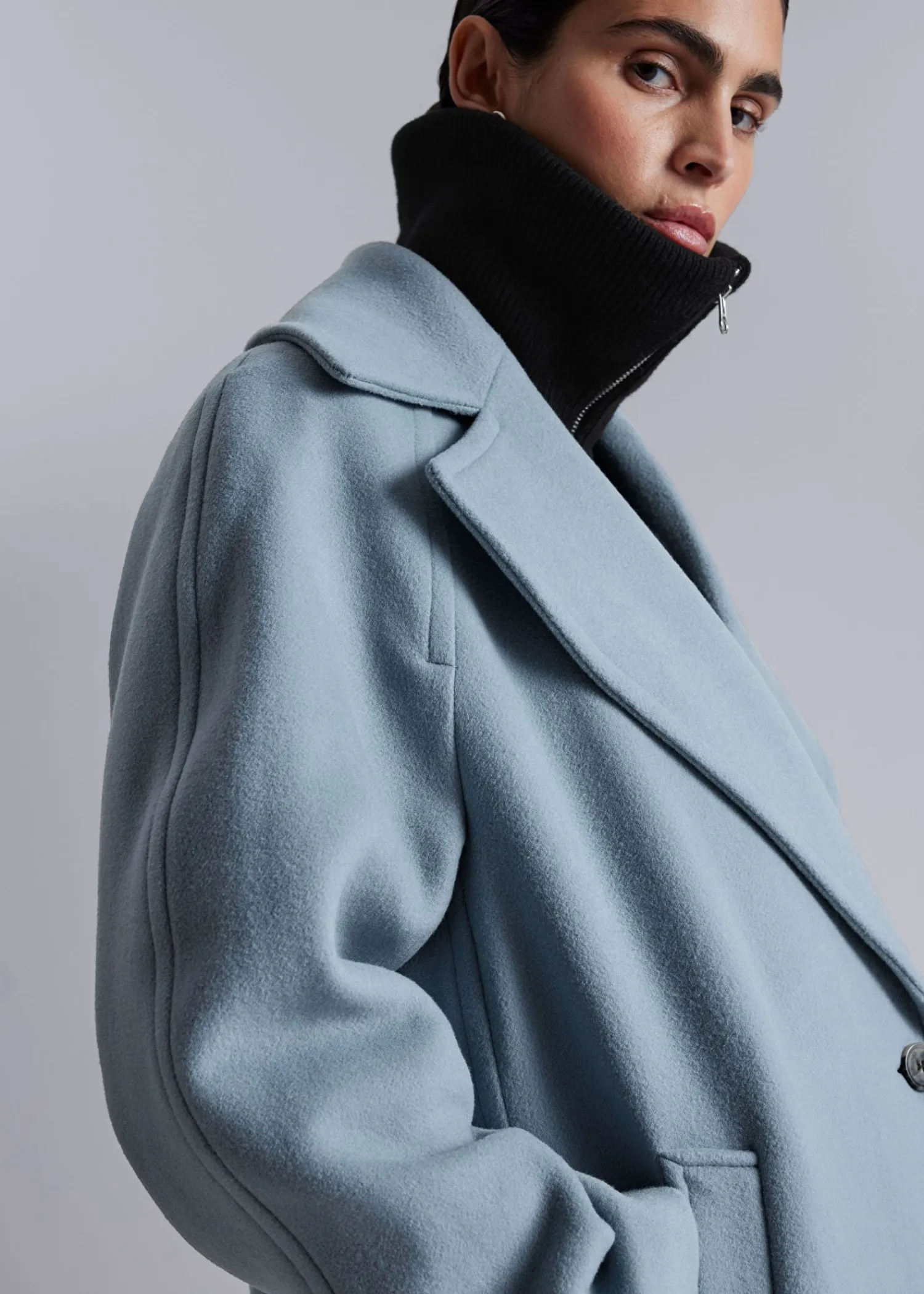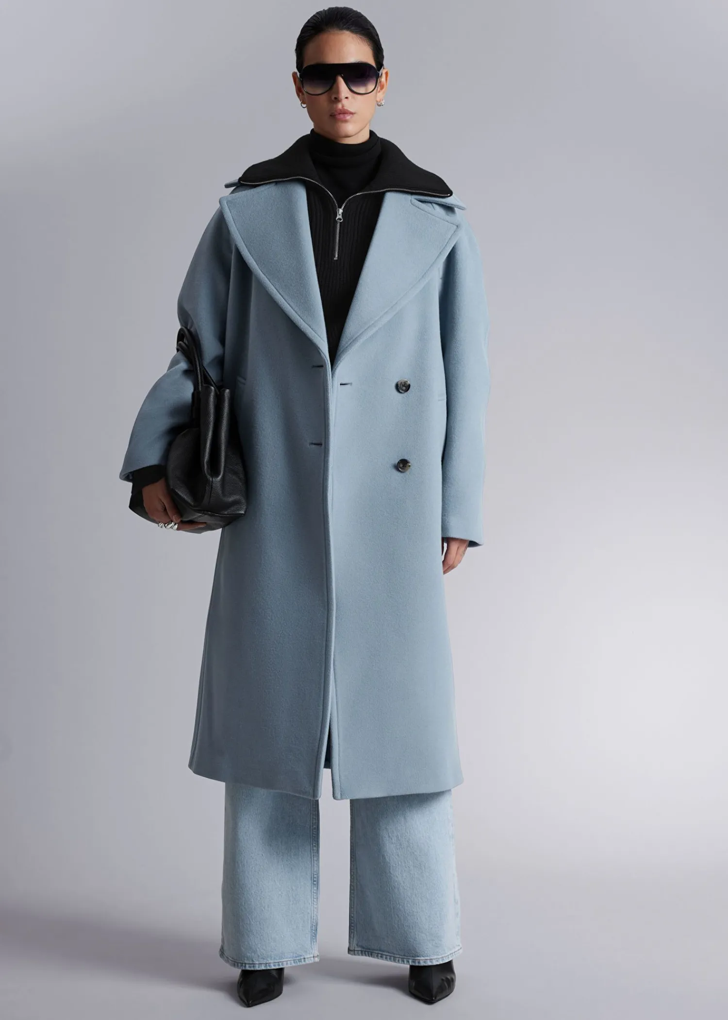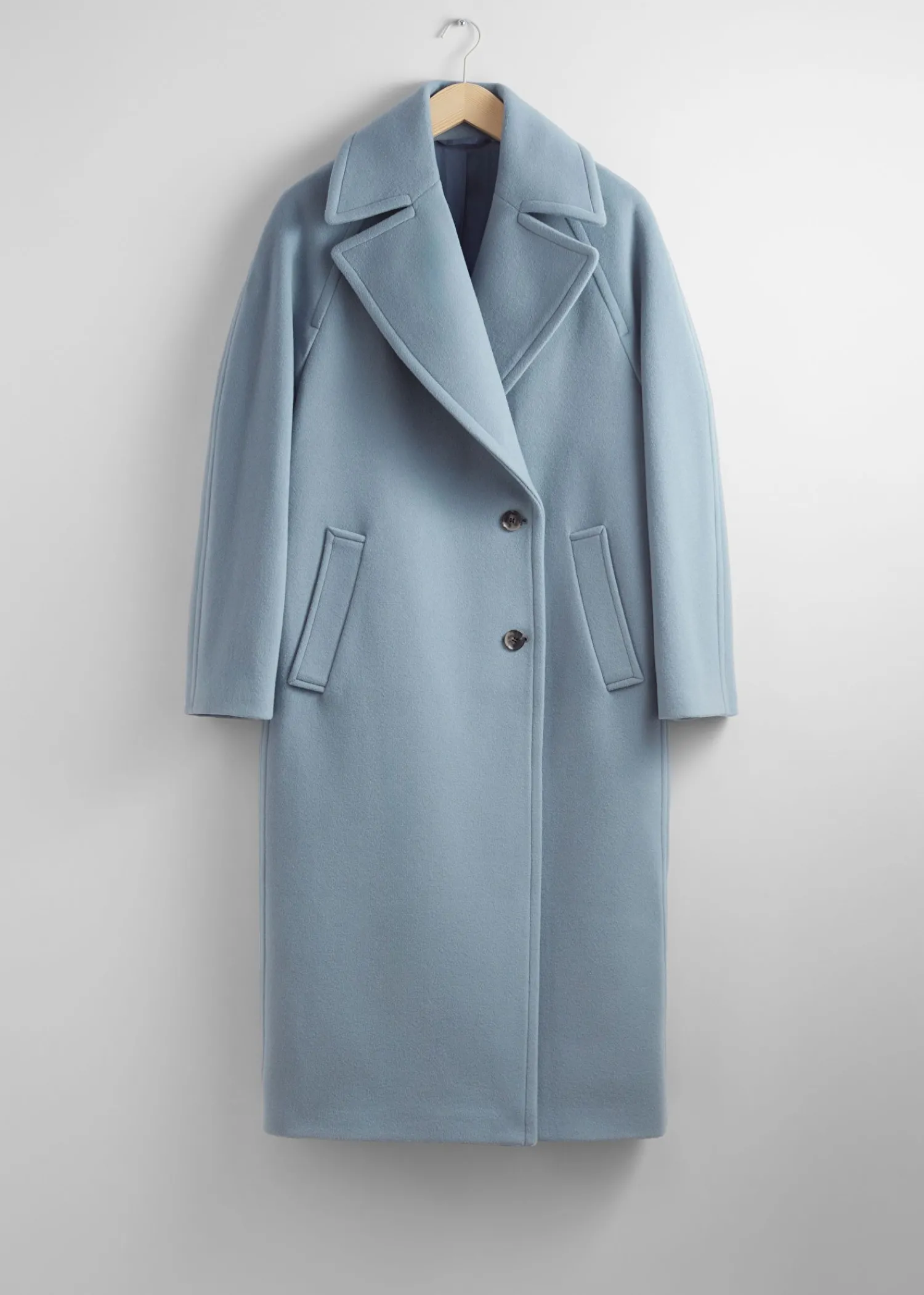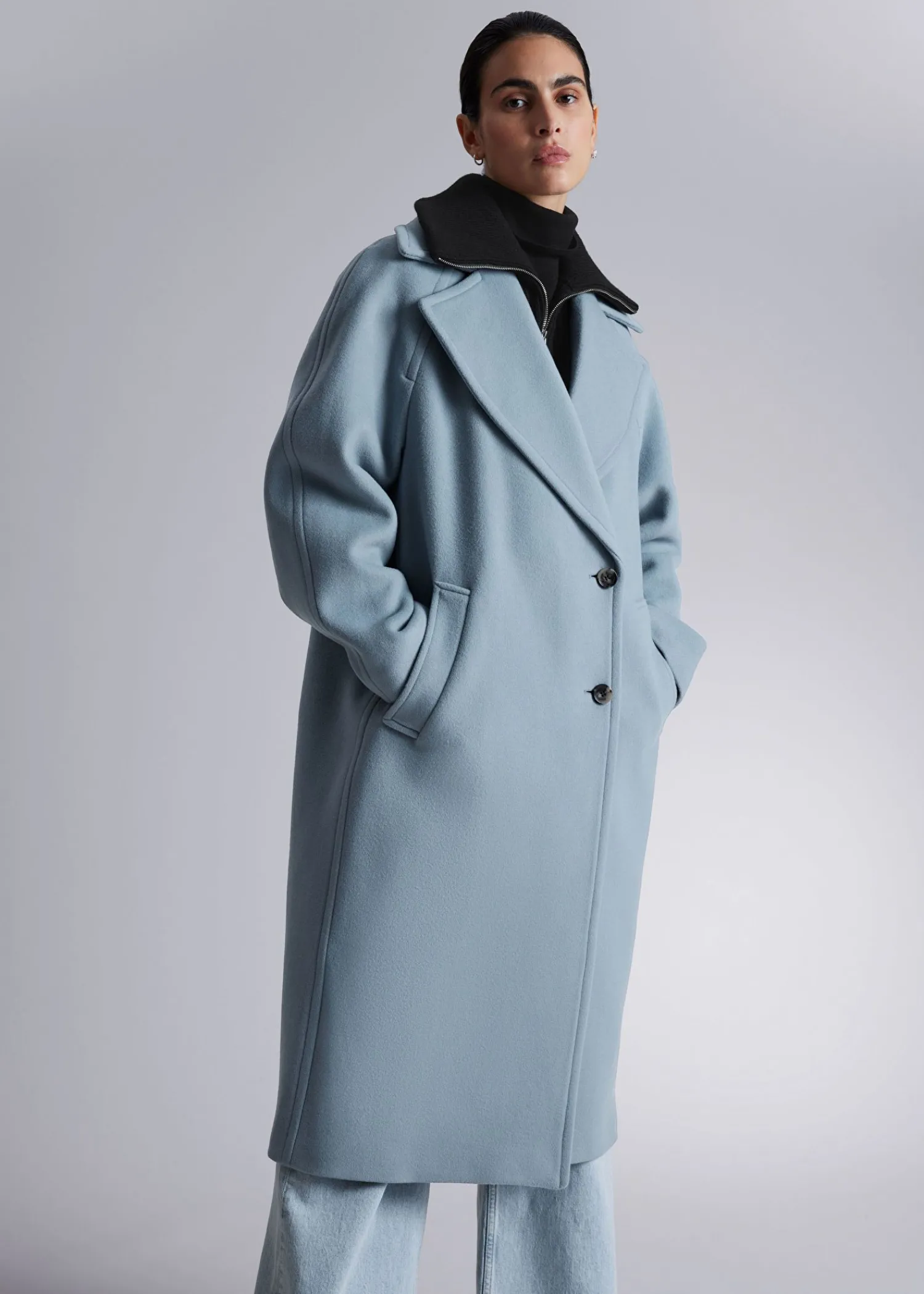 Oversized Enkeltradet Uldfrakke Afsluttet Med En Stor Krave. Duo Knaplukninger Duo Paspolerede Lommer 76% Rws Uld Certificeret Af Control Union 893290 Længde På Frakken: 117,5 Cm / 46,3″ (Størrelse S)